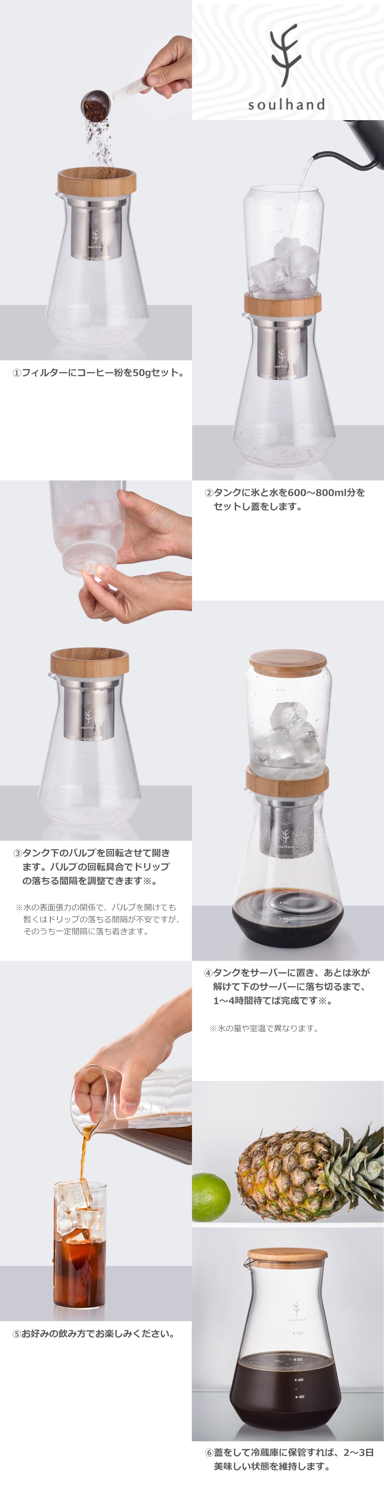 さらにSoul handコールドブリューコーヒーメーカーは0℃に近い冷水で抽出するので苦味や酸味を極力抑えクリアな味に仕上がります。