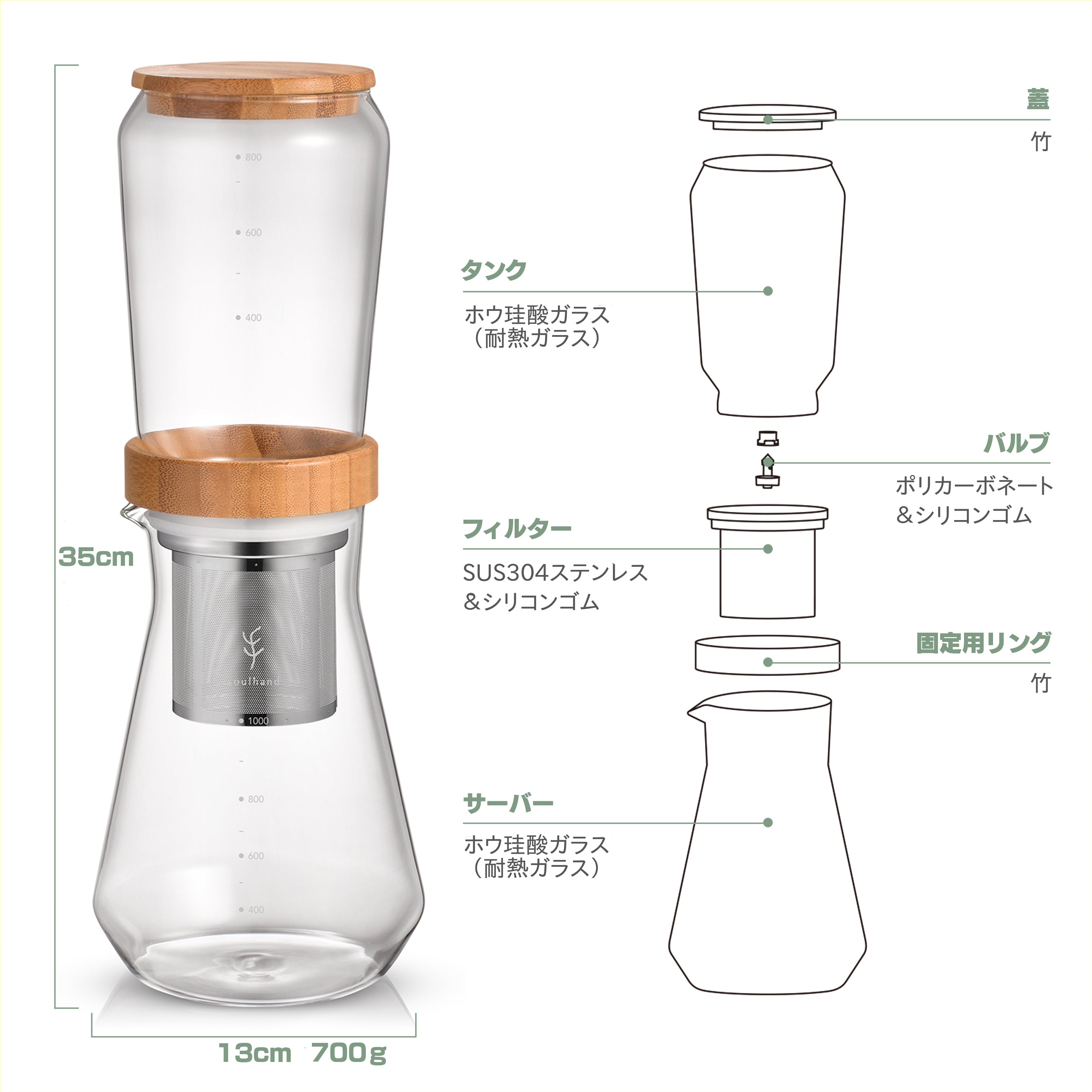材質:ホウ珪酸ガラス、竹、ステンレス、シリコン、PC