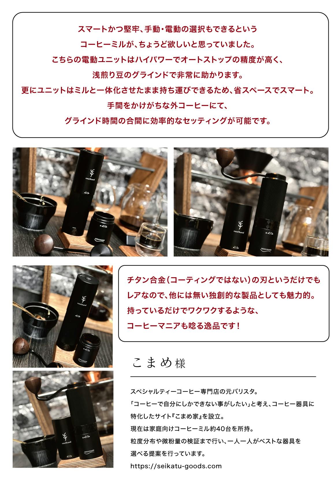 本商品については、日本製のミルにはない手動/電動の2WAY仕様であることに加えて、チタン合金製のグラインドコア、ボールベアリングの採用など、設計や材質へのこだわりの強さに大変魅力を感じました。
