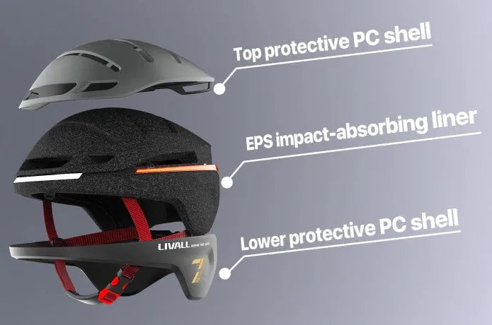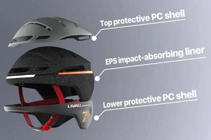 最初のレイヤーはポリガーボネートで作られ、衝撃を全体に分散させ、力を最小限に抑えて頭を保護します。