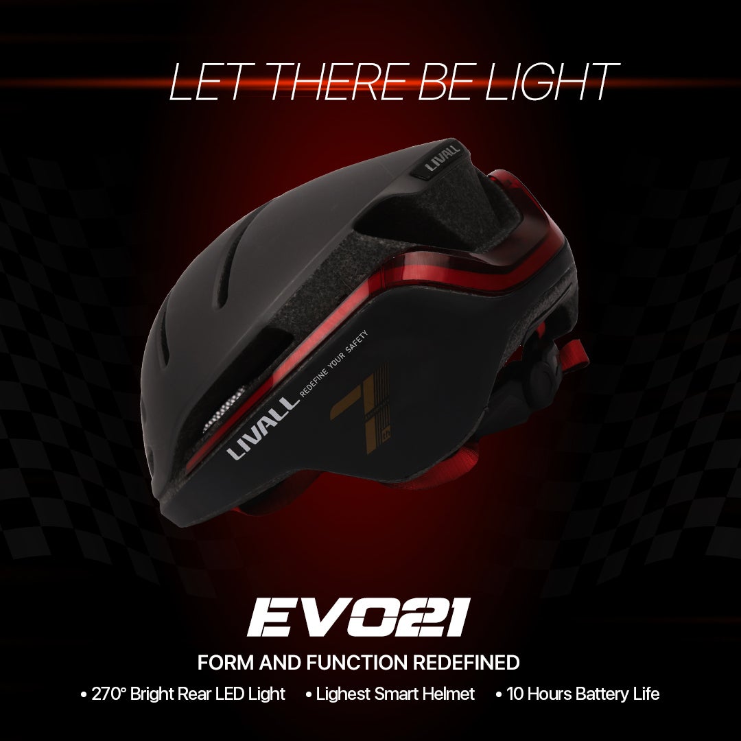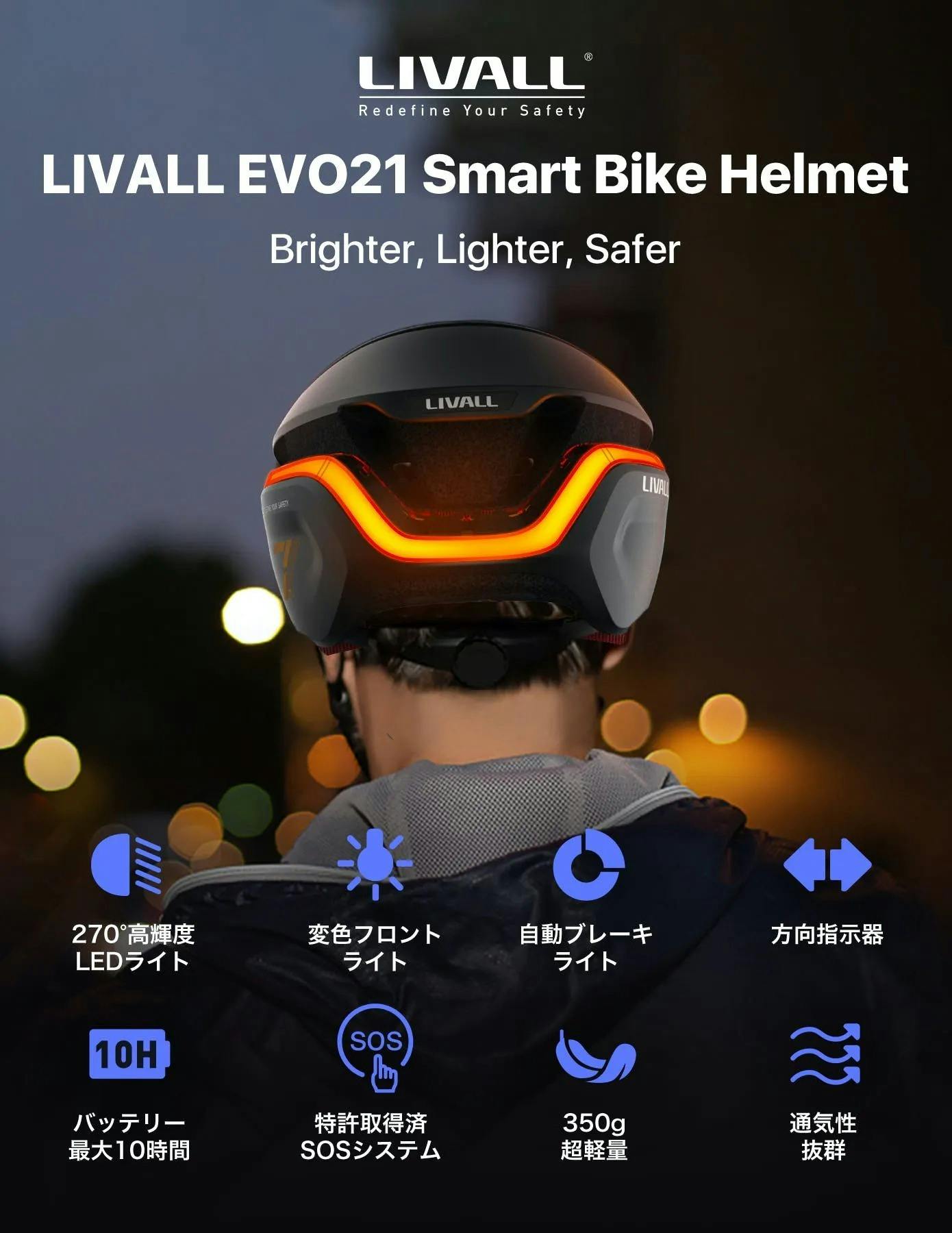 EVO21はこれまでのサイクリングヘルメットのデザインを一新。360°LEDライト・ブレーキ警告ライト・落下検知機能など、安全性を高めた「EVO21」を開発しました。