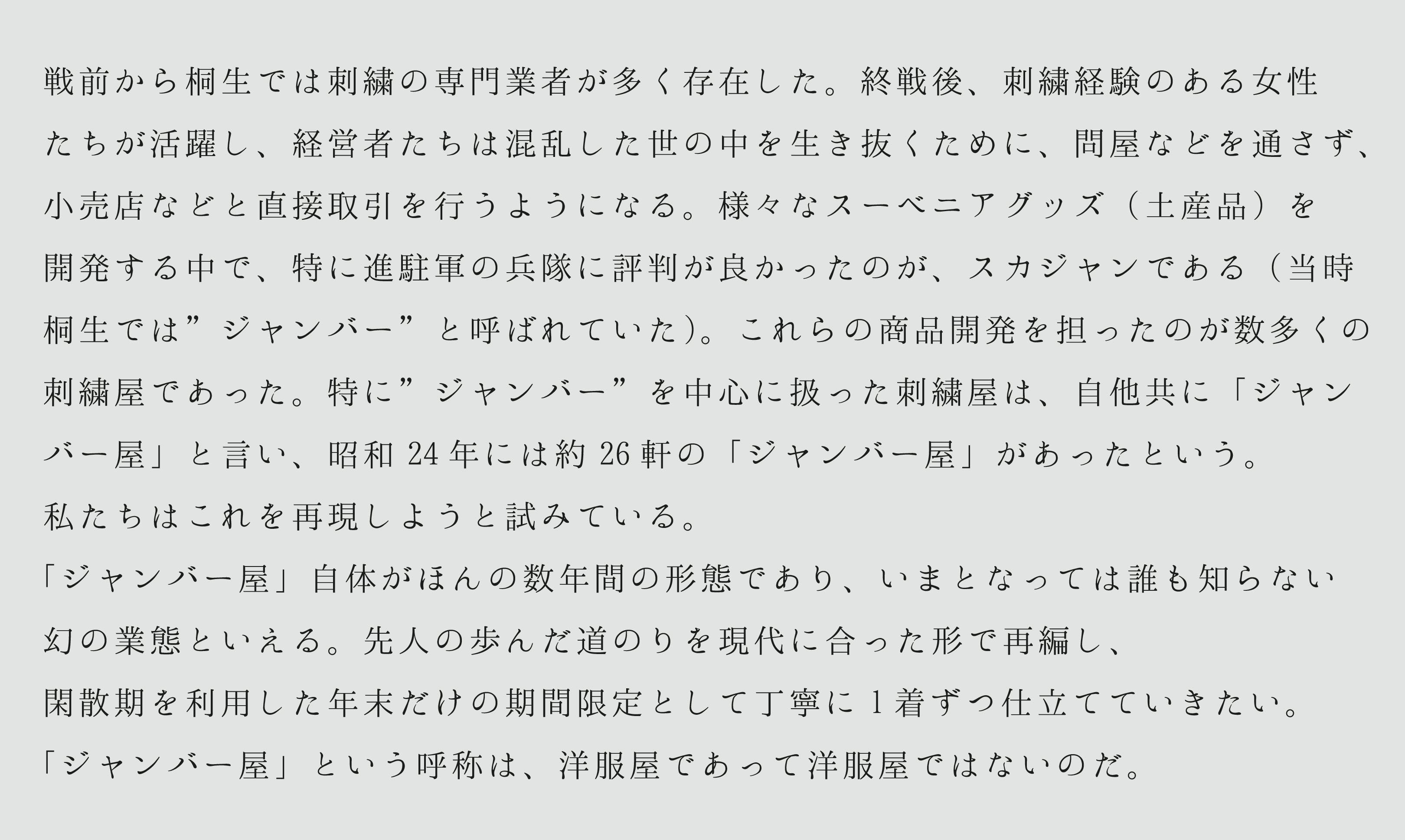 日本が進駐軍の占領地だった(1945~52年)頃 、私の祖母は桐生にお嫁に来ました。配給制で近所の人々と協力し合って、食料を融通しあったり、郊外の農家の元へ買出し部隊として出かけたりした時代でした。当時の桐生は群馬県内でも一番人口が多く、繊維産地として賑わっていたので、人も金も技術も集積していました。 そんな98歳になる祖母もスカジャンのことを知っているんです。年配の人々がスカジャンのことをこれだけ知っている街は世界でも桐生くらいでしょう。それだけ多くの人々がスカジャン生産に関わっていたのです。