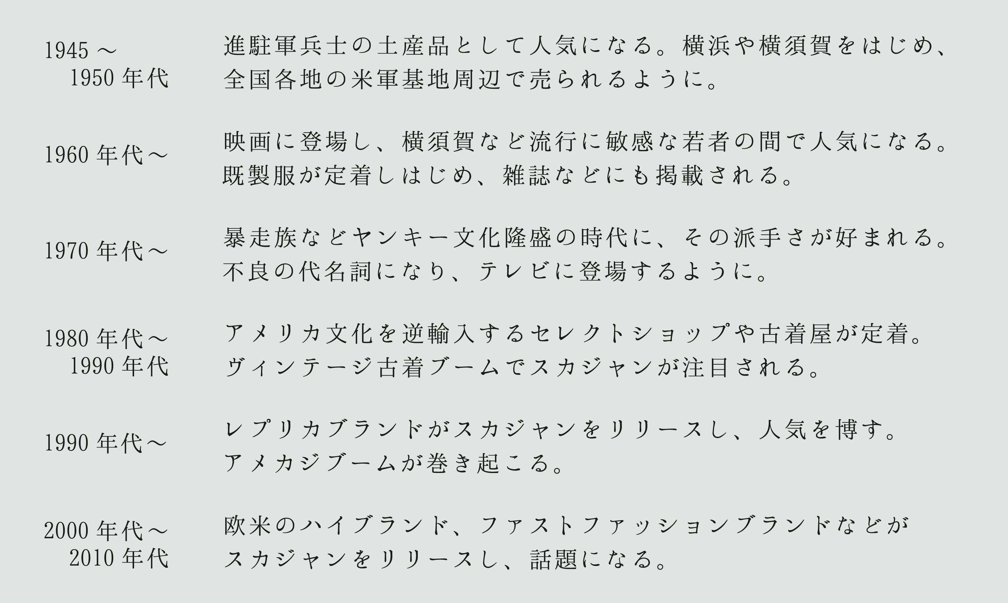 戦後、いちばん最初に作られたスカジャンは、米兵が使い古したパラシュートとベースボールジャンバーを持ち込んでオーダーメイドで作ったという説があります。 これを検証するための実証実験をYouTubeで無料公開し、世界に一つの令和版オリジナルスカジャンを仕立てます。この実験を通じて、皆さんが”スカジャンを再発見する”ことができればと思います。そこでまず、日本におけるこれまでのスカジャンの歴史をざっくりと年表にしてみます。
