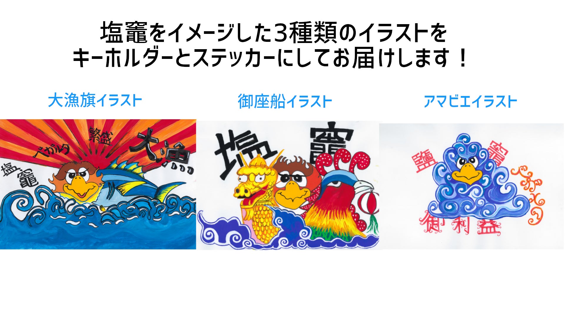 そこで、ベガルタ仙台とコラボし、地元名産品を支援するために本プロジェクトを起案いたしました。リターン品には塩竈の名産品が詰まった「塩竈 ベガルタBOX」を3種類ご用意。オリジナルパッケージでお届けします。また、今回ベガルタ仙台のクラブマスコット「ベガッ太」さんにご協力いただき、塩竈ベガルタBOXの食レポや、ご本人が自ら描いたイラストをもとに制作した限定ステッカー、キーホルダーをセットでお届けいたします。