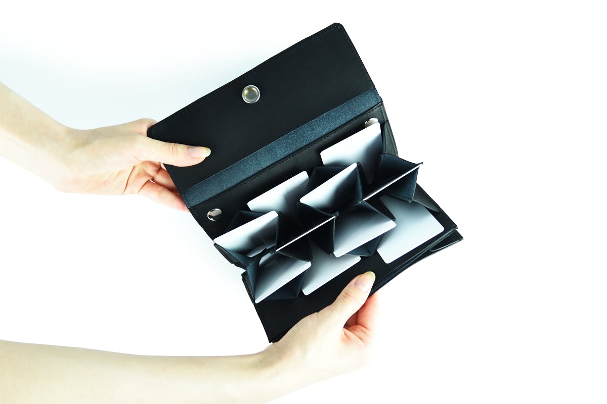とにかくカードの「取り出しやすさ」を目指しました。アコーディオンのように開くのでどこになにがあるか一目で探すことができ、掴みやすいためサッと出せてシュッとしまうことができます。
