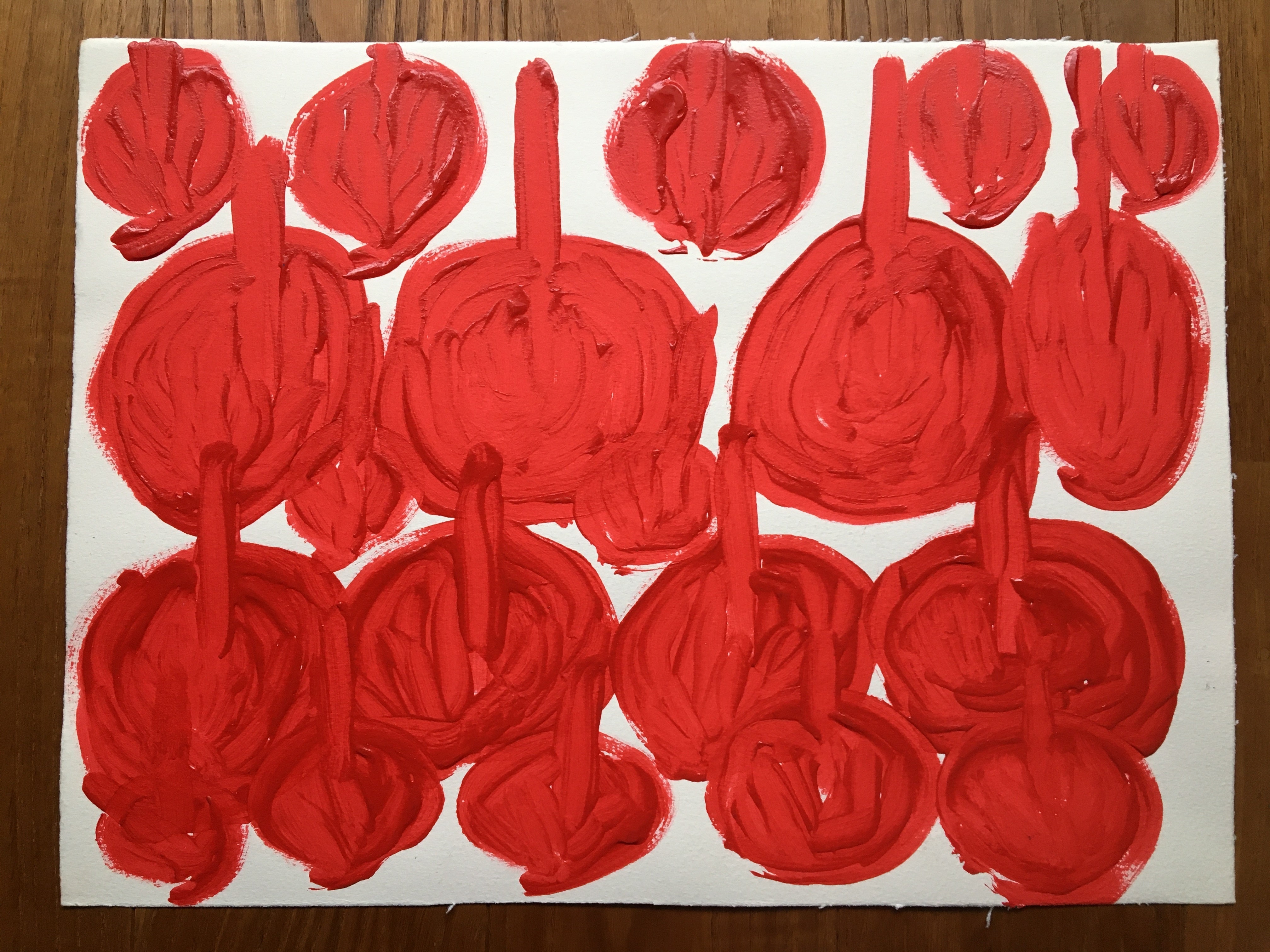 画面いっぱいに並んだ赤い丸。どちらが上かな?と作品の天地(上下の方向)を思わず迷ってしまう作品ですが、写真の向きが正解。そう、この赤い丸の正体はりんごです。筆の軌跡が力強さと勢いを感じさせます。赤一色で表現した潔さも見事です。りんごとりんごの隙間もりんごで埋め尽くしたい、そんな熱いりんごへの情熱が伝わります。りんごいっぱいのハンカチ、きっとかわいくなります♪♪