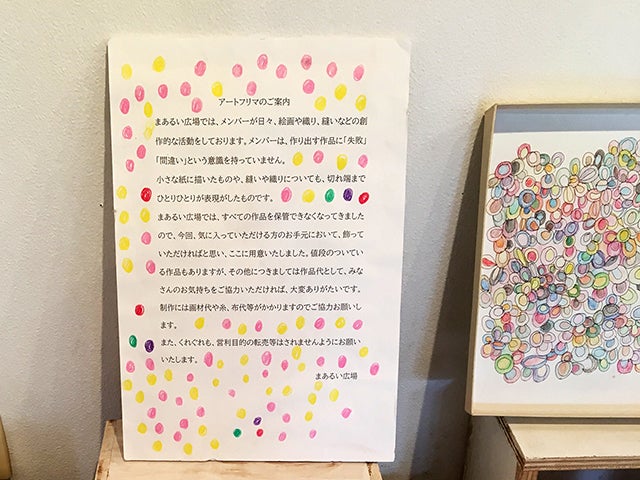 『まあるい広場では、メンバーが日々、絵画や織、縫いなどの創作的な活動をしています。小さな紙に描いたものや切れ端まで、ひとりひとりが表現したものです。まあるい広場では、すべての作品を保管できなくなってきましたので、今回、気に入っていただける方のお手元において、飾っていただければと思い、ここに用意いたしました。作品代としてみなさんのお気持ちをご協力いただければ、大変ありがたいです。』