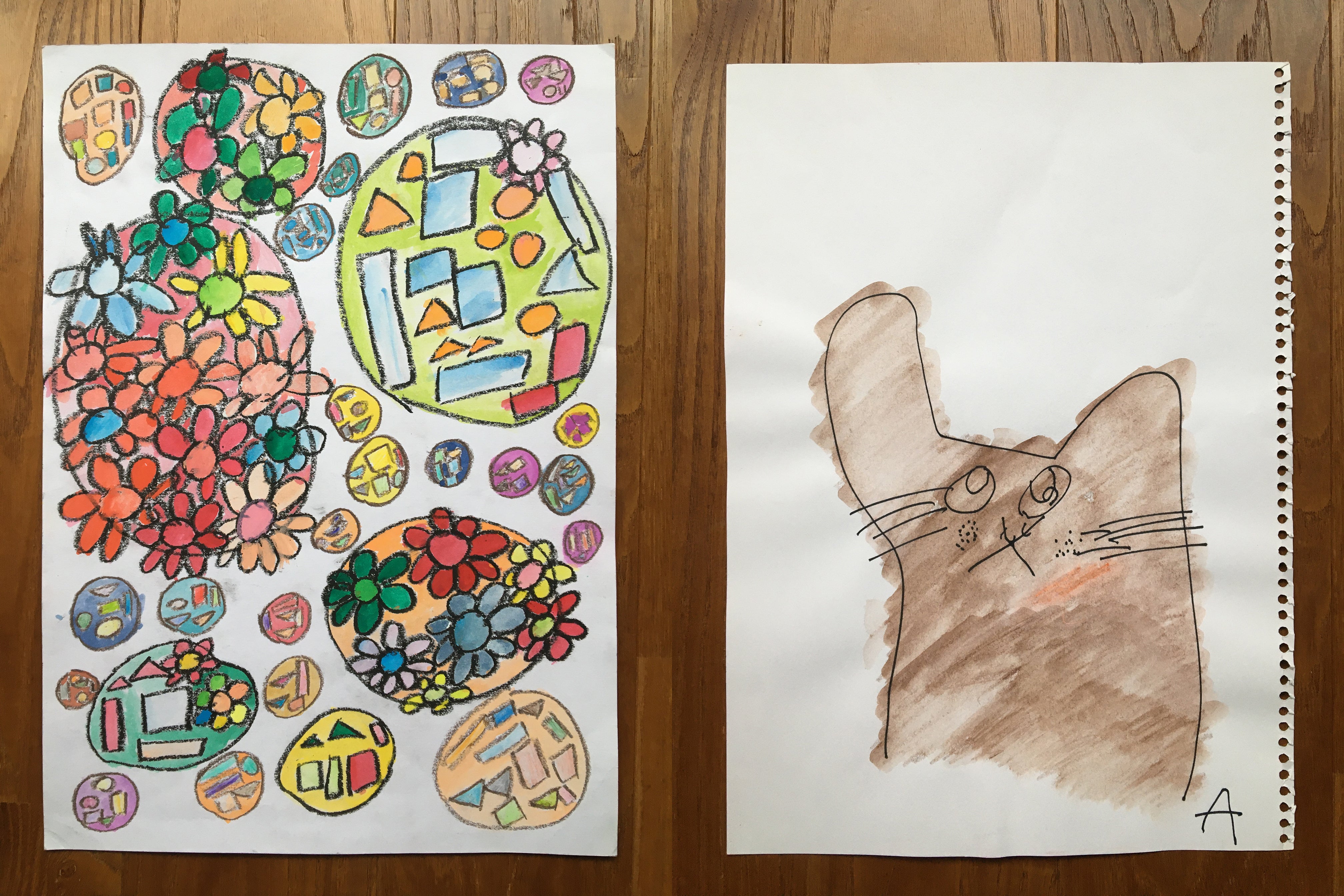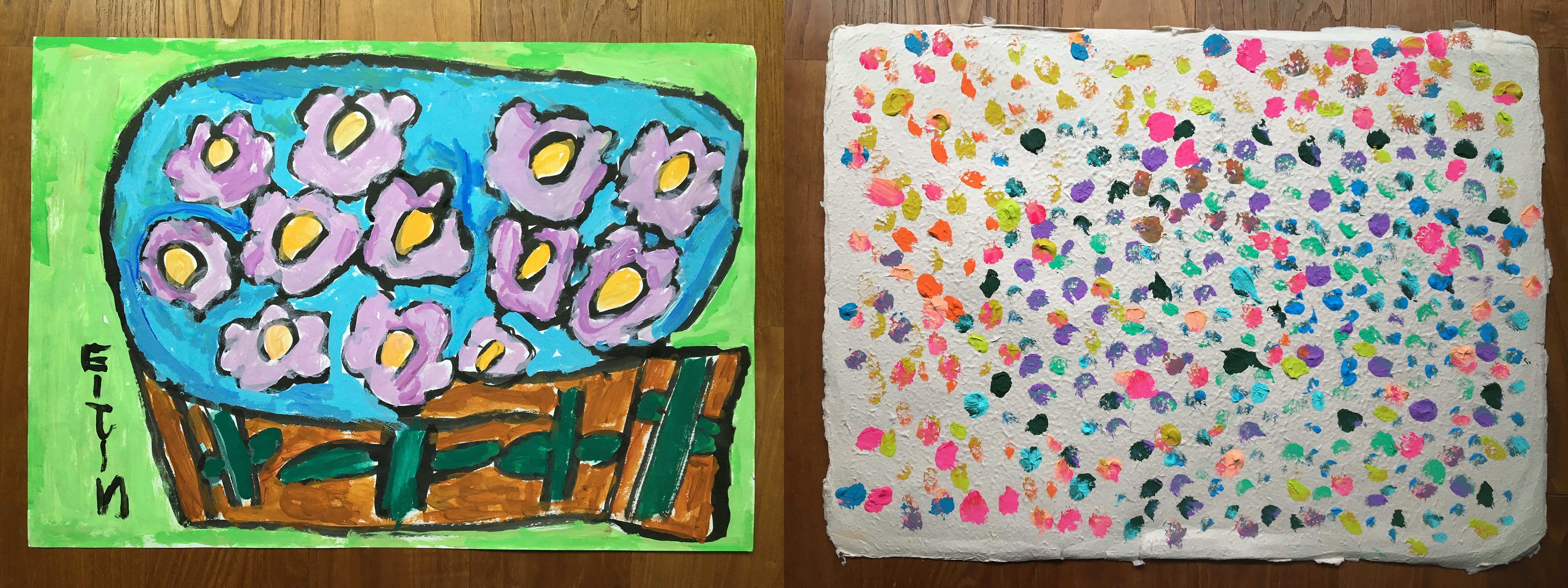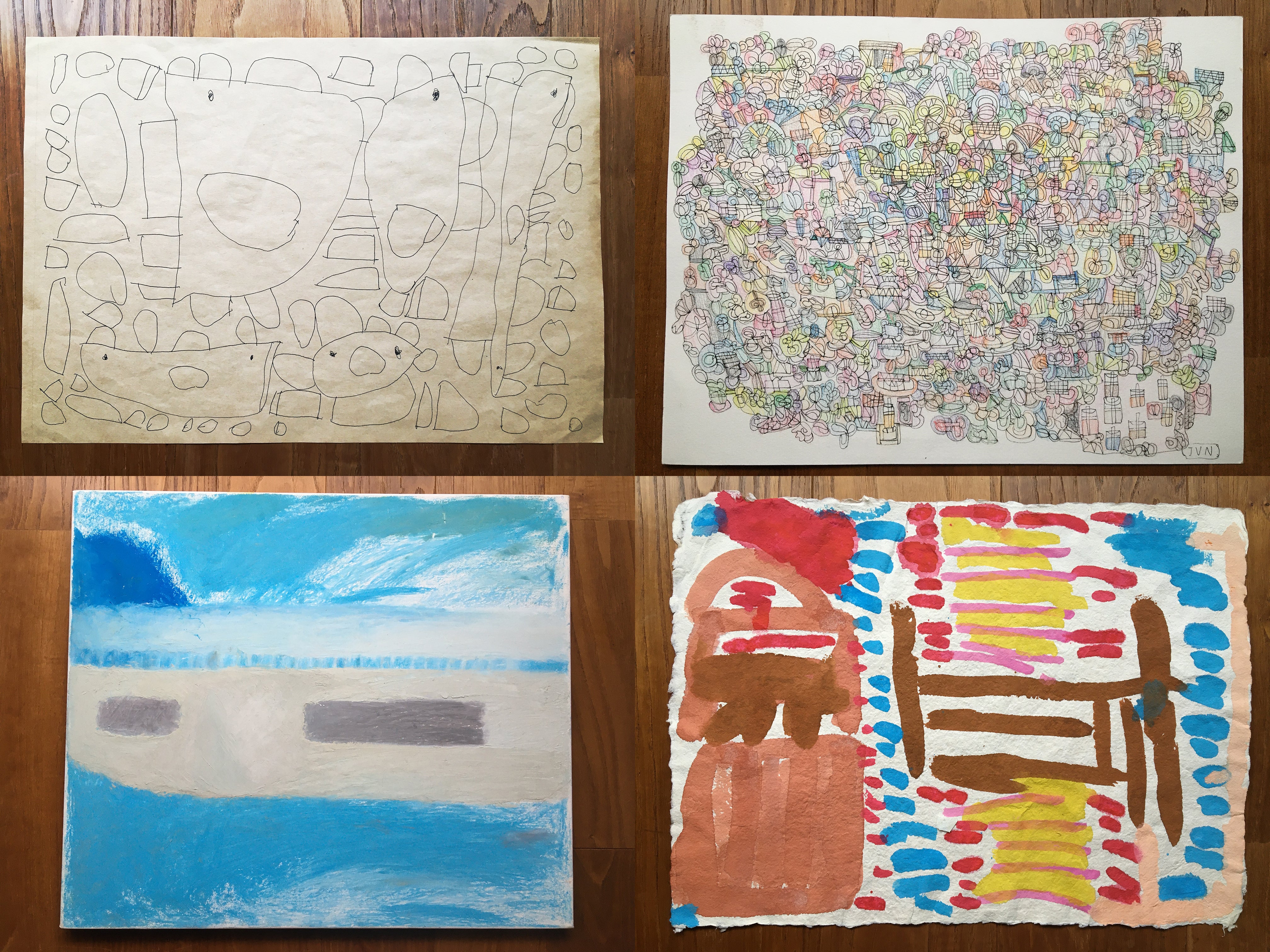 まあるい広場に通う障害のある方々がこれまでに描きためたアート作品は、数えきれないほどたくさんあります。ポストカードサイズの小さなものから大きなパネル作品まで、また画材も鉛筆やボールペンなどの身近な文房具から水彩絵の具やアクリル絵の具までと様々です。今回、ハンカチの企画を担当してくださるブルーミング中西のデザイナー・麻生様にもアドバイスをいただきながら、たくさんの作品の中から10作品を厳選してセレクトしました。