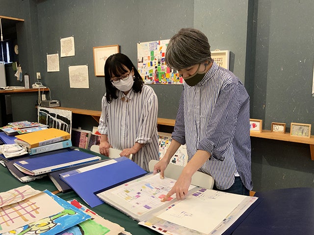まあるい広場のギャラリーで原画をセレクトする柊(写真右)と麻生様(写真左)