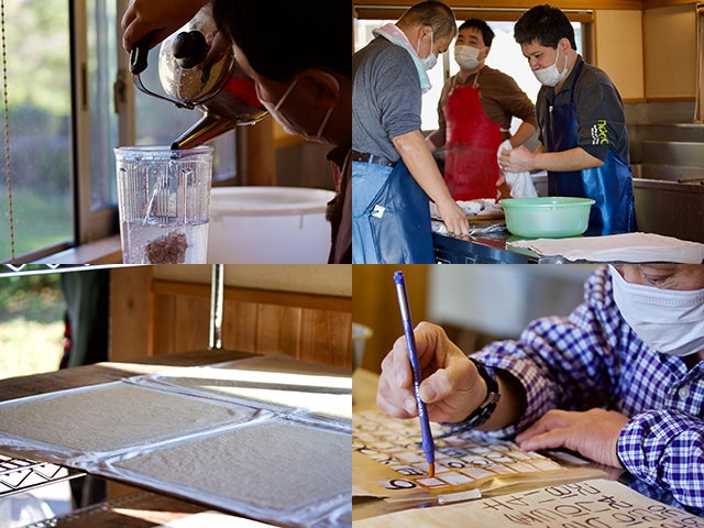 まあるい広場での紙漉き作業、製品作りの様子