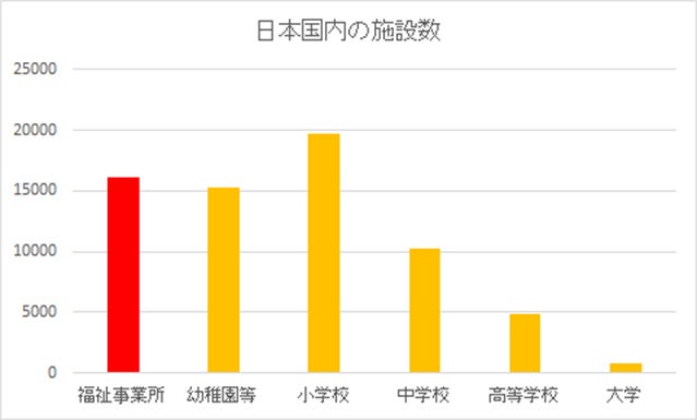 現在、日本全国にある福祉事業所の数は16,157施設です。(※1)これは、日本の幼稚園等の数と似ています。ちなみに、小学校は19,738校、中学校は10,222校、高等学校は4,887校、大学は786校。福祉事業所はそれぞれの地域に必ずある、身近な施設なのです。(※2)
