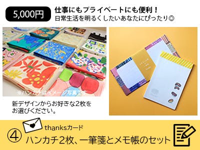 リターン購入者様とは別の場所に、オリジナルギフトパッケージ入りのハンカチ1枚をお送りします。