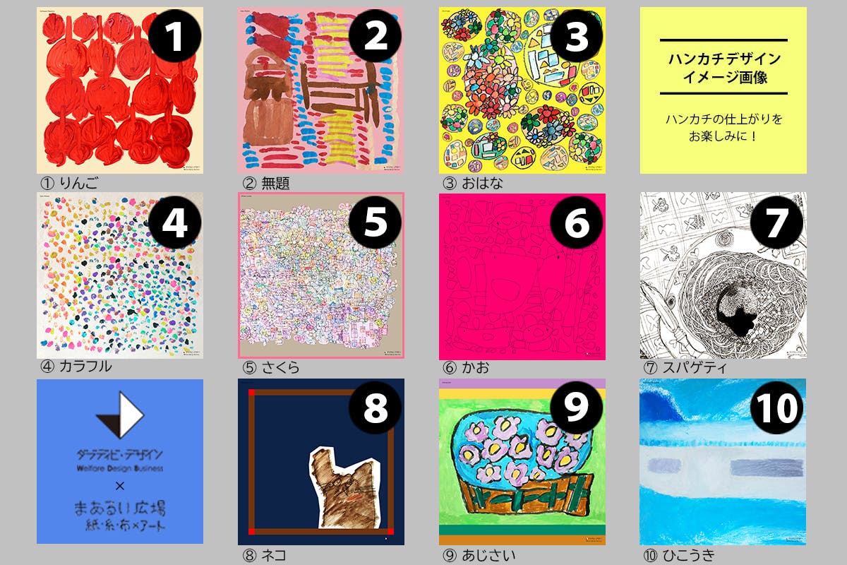 原画の魅力を活かしながら、ハンカチになったときにより素敵に見え、尚且つ、ハンカチとして使いやすくなるようにデザインしました。