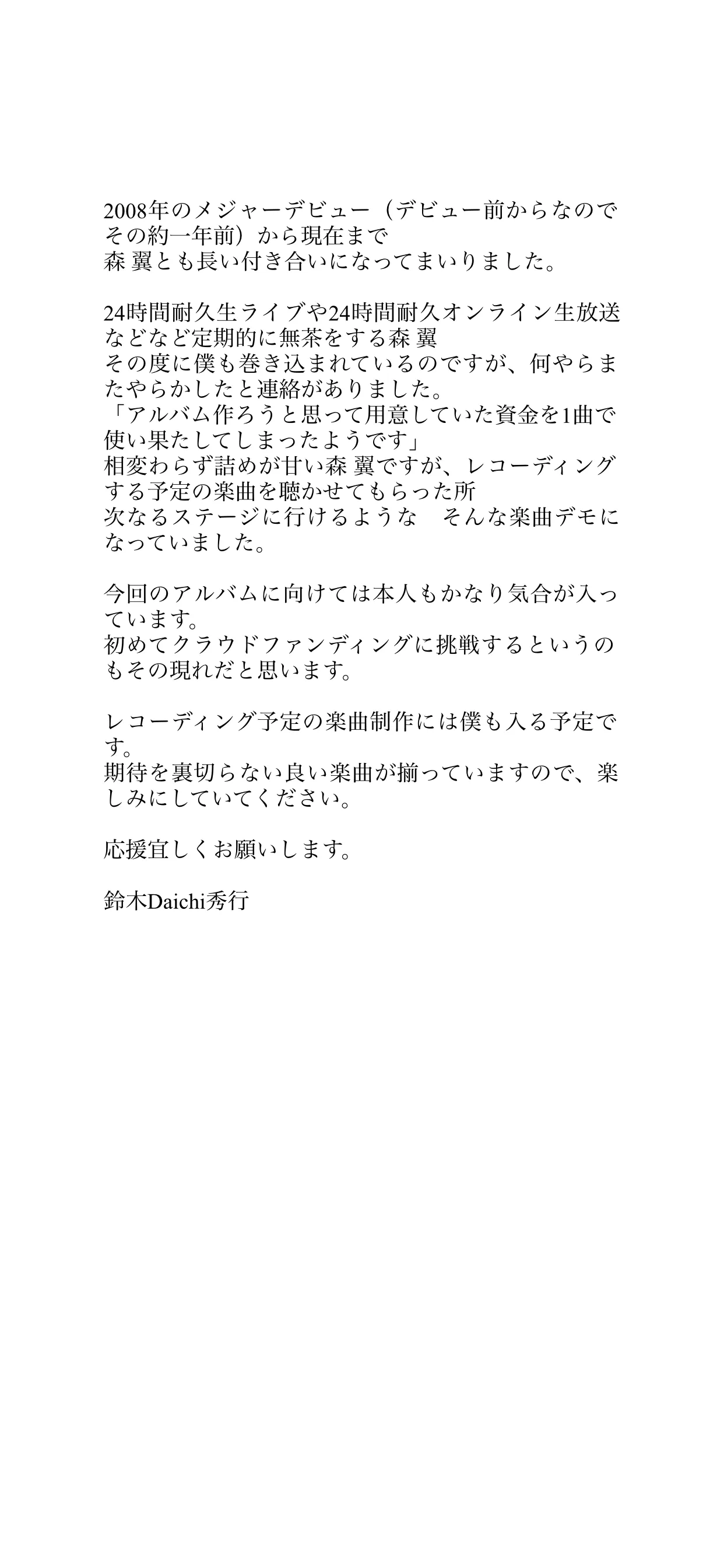 どうも、シンガーソングライターの森翼です。2008年にポニーキャニオンよりメジャーデビューしまして「家庭教師ヒットマンREBORN!」のEDなどを歌わせてもらっていました。