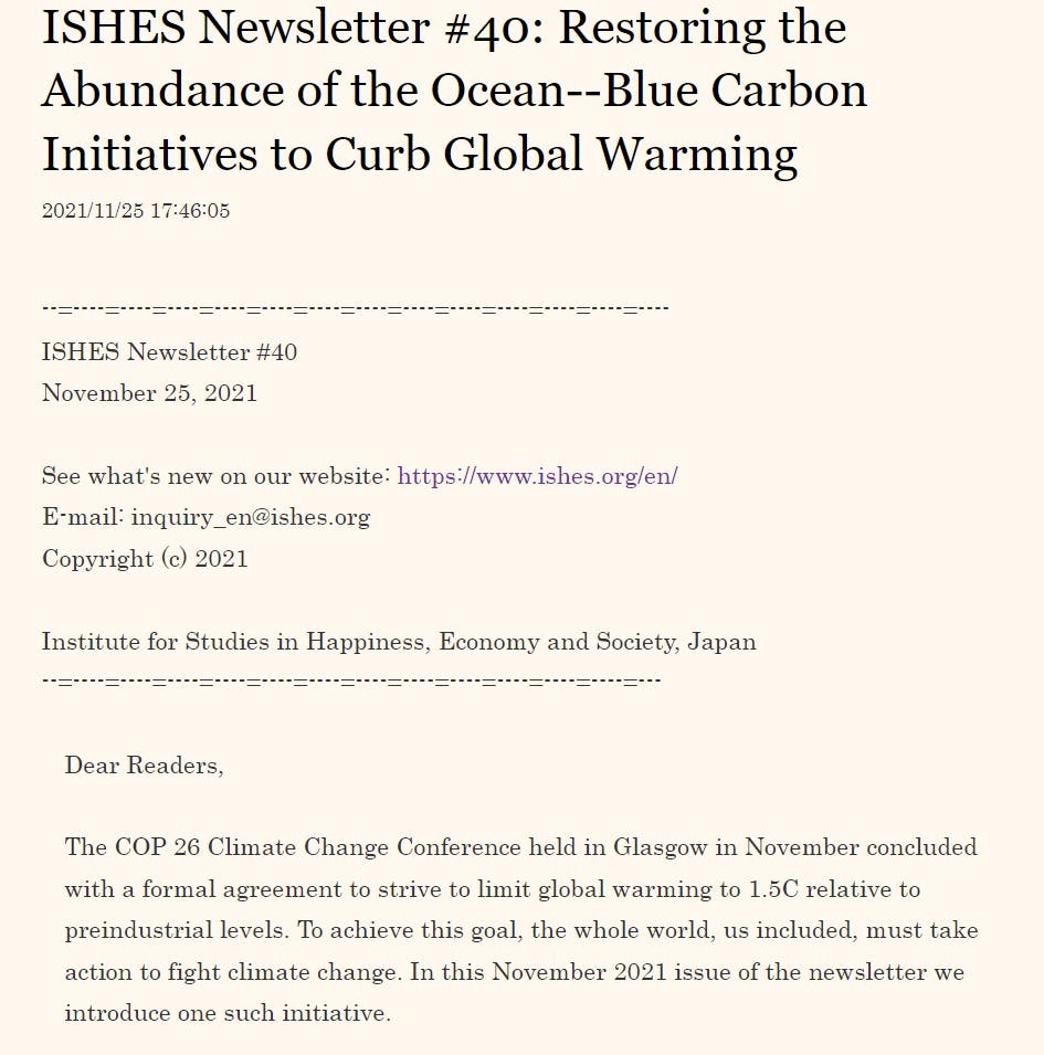 ISHES Newsletter #40: Restoring the Abundance of the Ocean--Blue Carbon Initiatives to Curb Global Warming