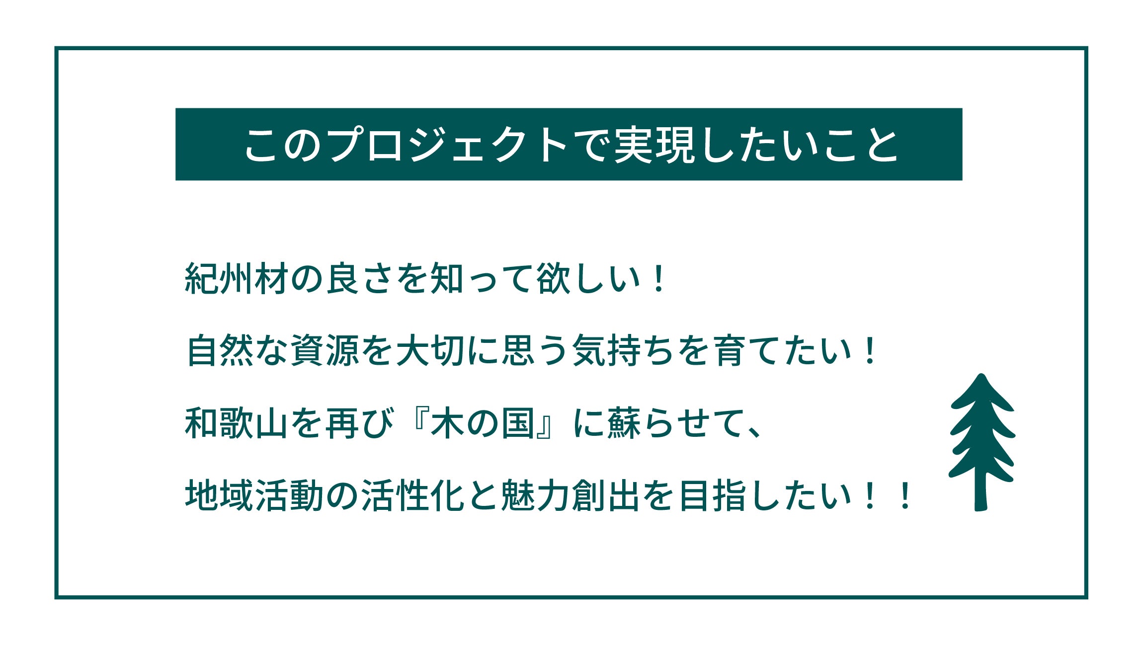 このクラウドファンディングを通じて、さらにたくさんの人に知ってもらい、和歌山の豊富な森林資源に、新しい価値を生み出してくことを目指しています。
