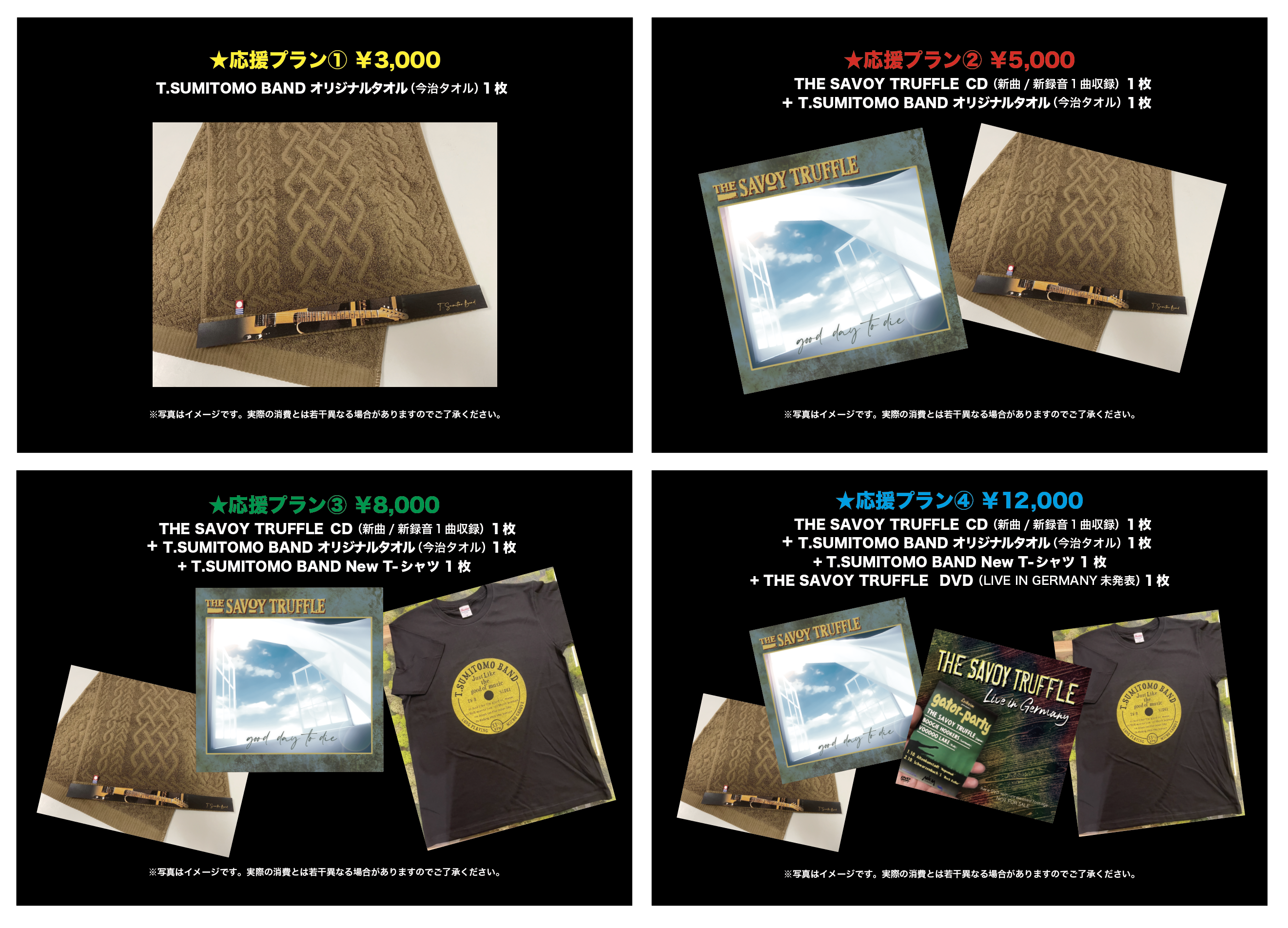 皆様から寄せられました支援金は、住友俊洋マネージメントオフィスであるジョイフルノイズが一括してお預かりし、リターンにかかった最低限の経費を差し引いた後、住友の今後の音楽活動にあてさせて頂きます。