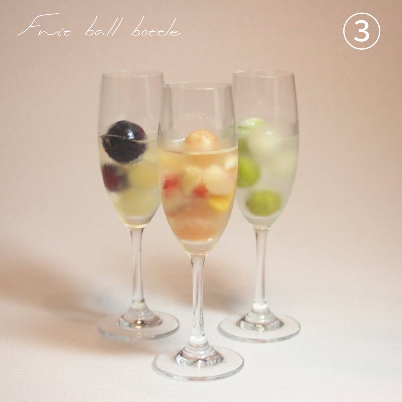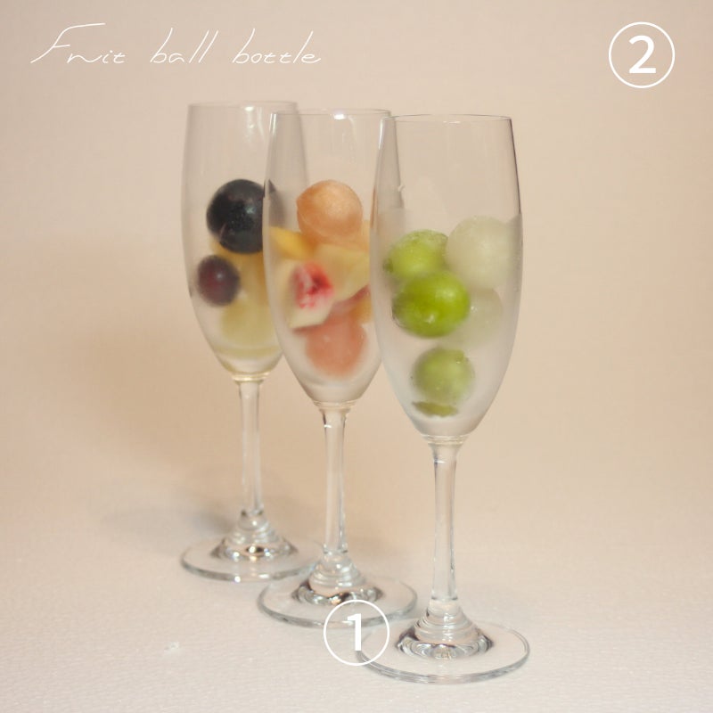 ②ワイングラスに果実とフルーツボールをお好みの量入れ、白ワインやシャンパン、ソーダなどお好みのドリンクで割ります。