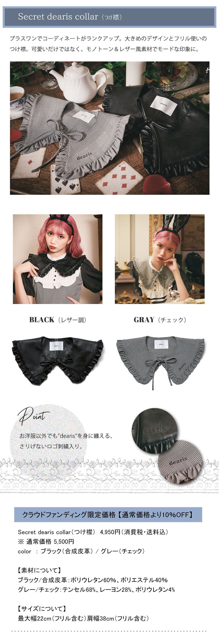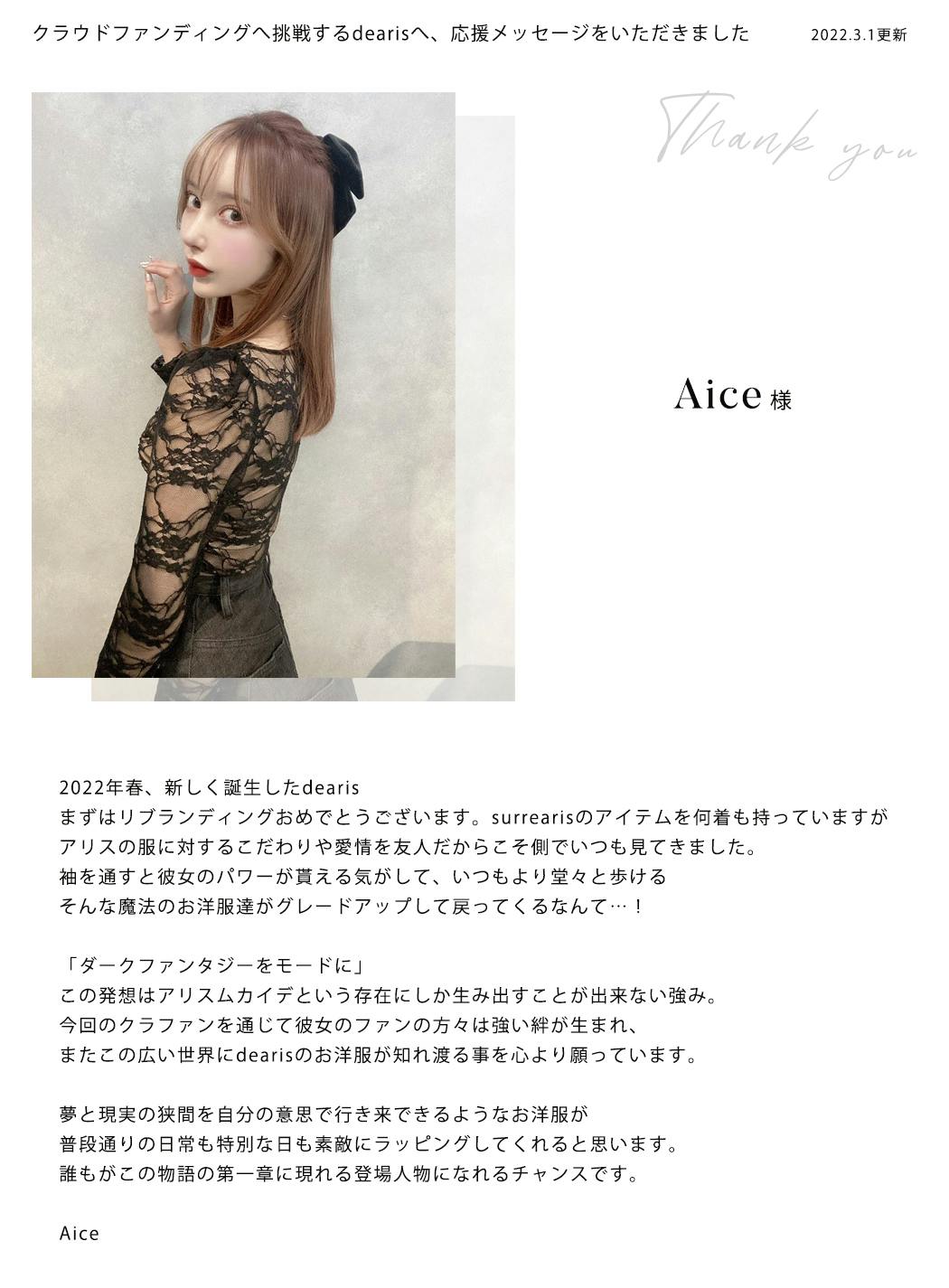 洋服が与えてくれる強さだったり、自信だったり……私たちはこのブランドを通してそんな気持ちを伝えたいと思っています。今までsurrearisを愛してくれた人、今日初めてdearisを知ってくれた人・・・窮屈でつまらない毎日の中に見つけた、小さくて繊細な自分だけが気づけた幸せのような存在を。アリスムカイデを筆頭に、dearisチームとして、そんな支えになりたいと心から願っています。数多くのアパレルブランドが存在する世の中で、私たちが作る洋服やdearisの世界観を提供しつづけていく為に、もっともっと見たことのない世界をお届けできるよう、皆様にお力添えいただきたく、今回プロジェクトを実施することにいたしました。