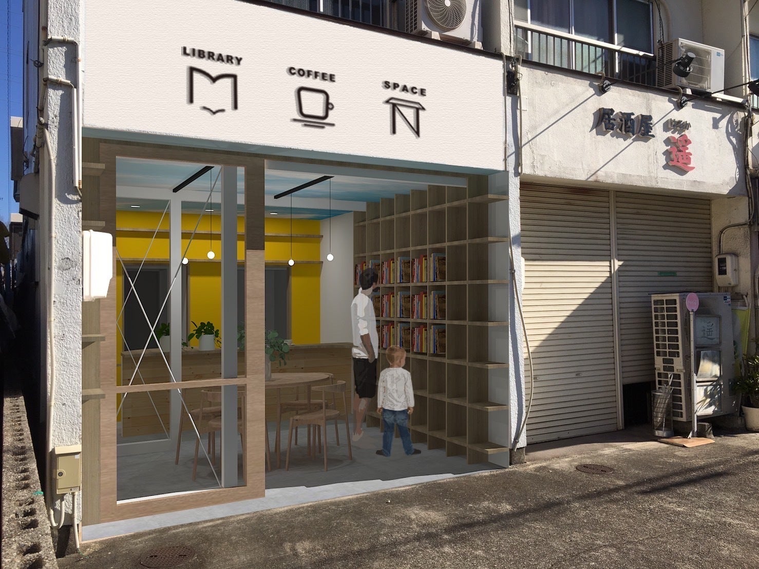【改装後イメージ】図書館、コーヒー、レンタルスペースがある事が外からも分かるような看板