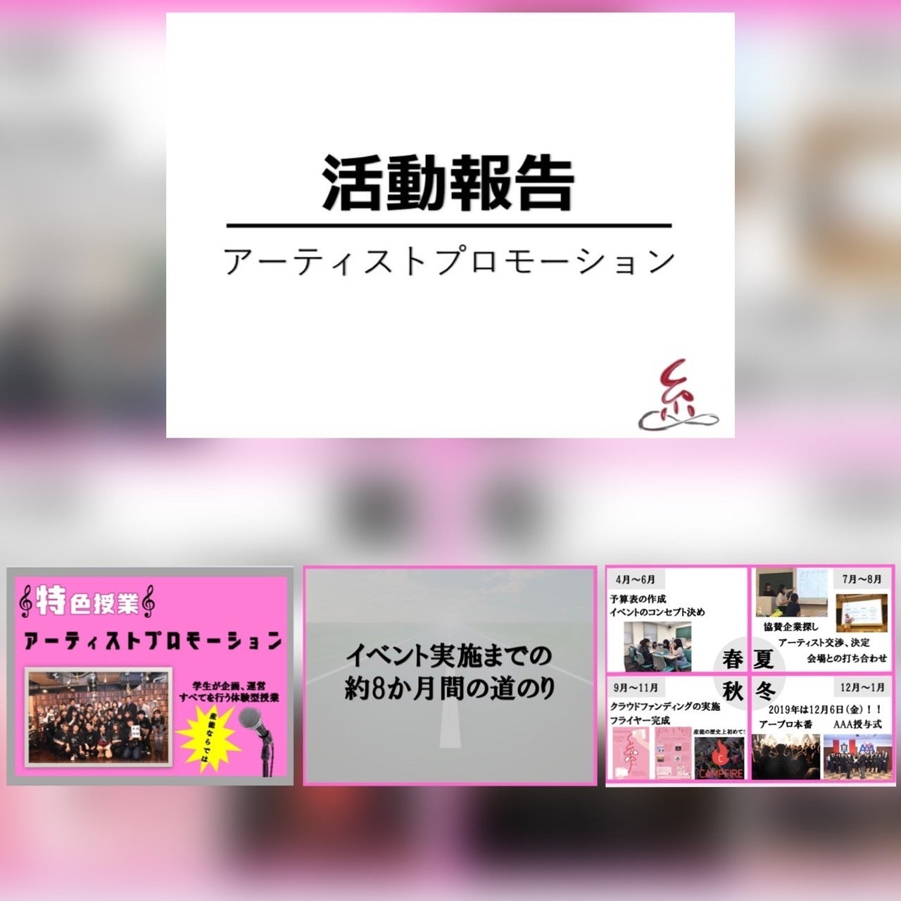 はじめまして!産業能率大学アーティスト・プロモーション受講生です。アーティスト・プロモーションとは、一年を通して学生だけでイベント制作にあたり、企画・運営の力を養いながらエンターテインメントについて学ぶ授業です。志望書を書き、選考を通った熱意のある学生のみが履修しており、毎日力を合わせて運営にあたっています!