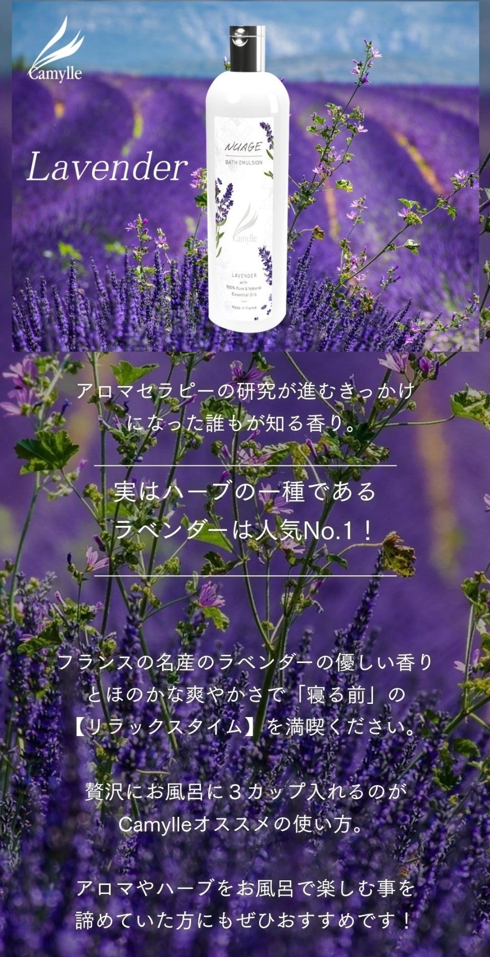 A:今までは、アロマをお風呂に入れる事は肌とアロマ液が接触してしまうので、推奨をされていませんでしたが、乳化液のCamylleなら大丈夫です!