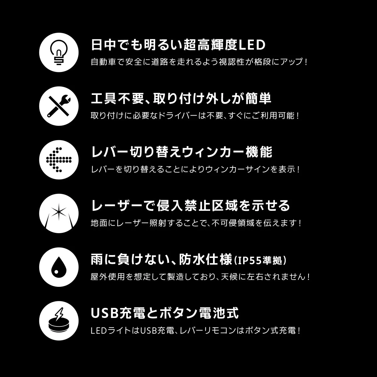 ウインカーライト、不可侵領域を示すレーザーライトの機能を2in1で備えており、日常生活でのライディングの様々なニーズに応えます。