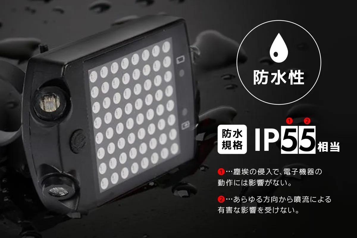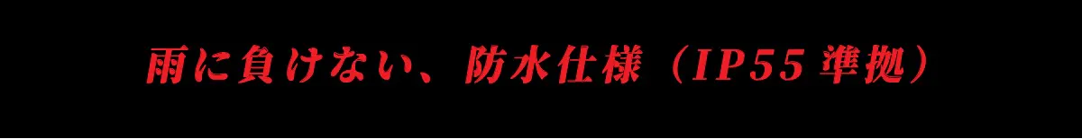 屋外使用を想定して製造されているため、IP55の信頼性のある防水等級でホコリや強い雨風も通しません。