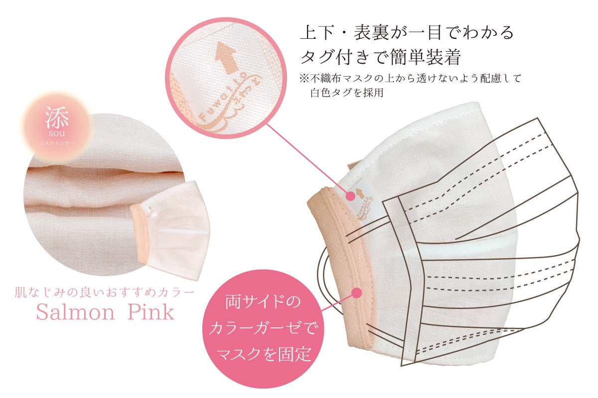 上下・表裏が一目でわかるようなタグ付きで、簡単にマスクに付けれるような構造、一度着けたらお顔になじんでフィット。お顔からマスクを外した時でもマスクたちは重なって寄り添ったまま。再度お顔に付ける際にずれたりなどの煩わしさは感じにくく困りません。両サイドにみえるガーゼは、肌なじみの良い色などを選ぶことが可能です。