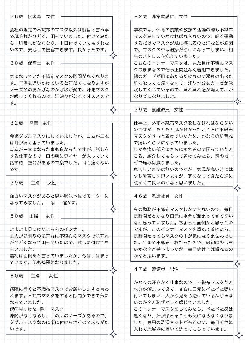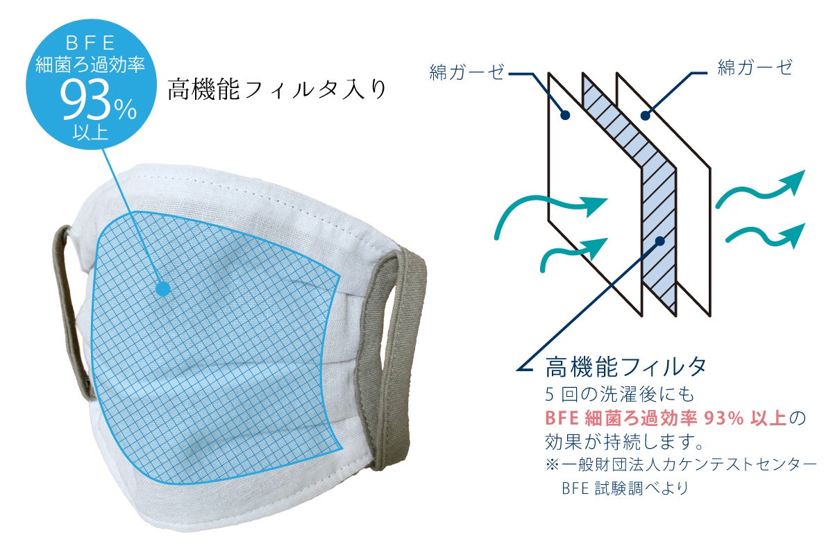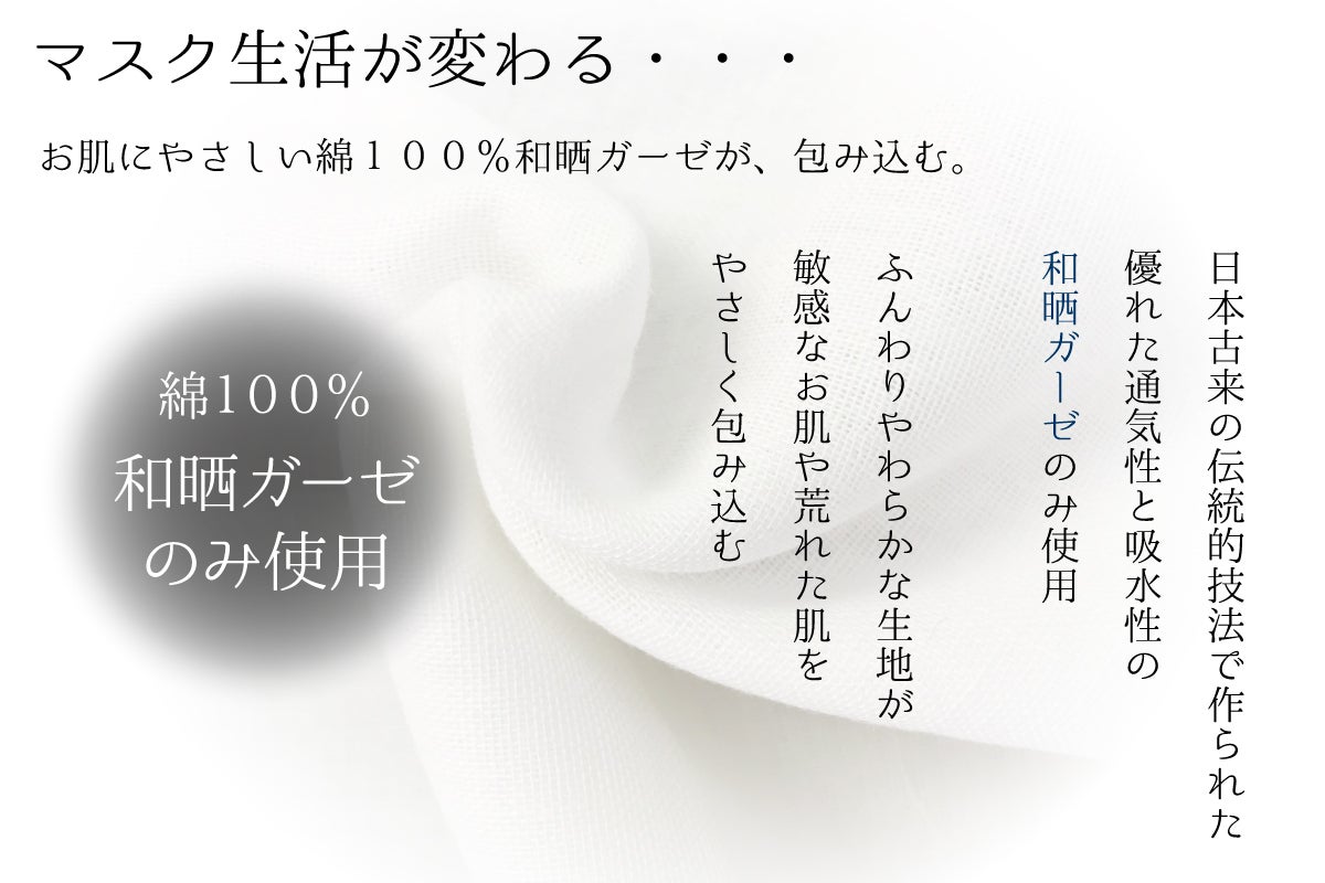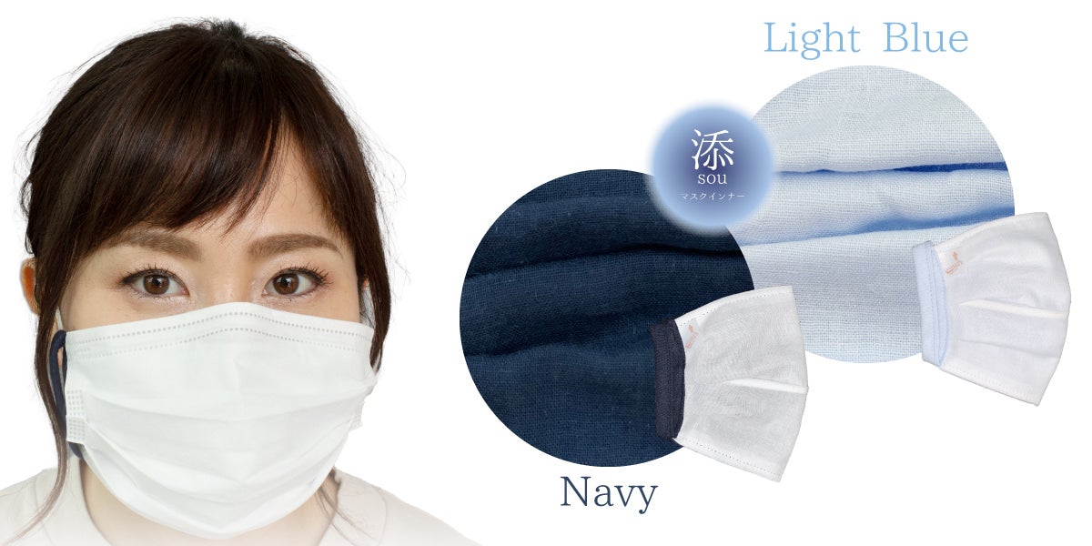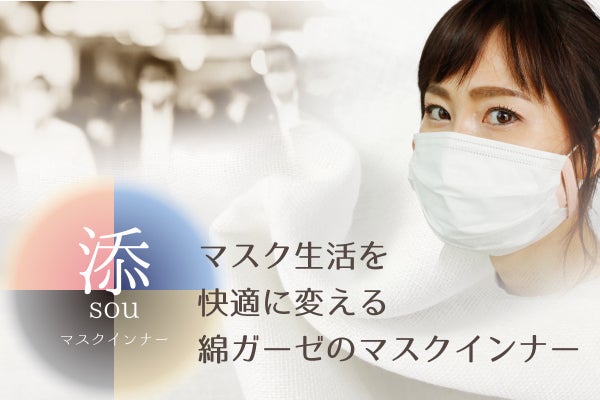 私共の会社は、創立26年、綿ガーゼなどを含む衛生材料を扱っております。昔ながらの綿ガーゼを平たんに折りたたんだだけのマスクに始まり、現在はサージカル不織布マスクの取り扱いもある中、自社のガーゼと手に入る高機能フィルタを使った着心地にこだわったオリジナルの高機能布マスクを開発。根強いリピーターを得続けていた最中、コロナ禍に突入し、マスクの供給が途絶えた際にも安定した販売をしておりました。さらに、不織布マスク推奨がうたわれてきたため、この『添~sou~』の開発に至りました。