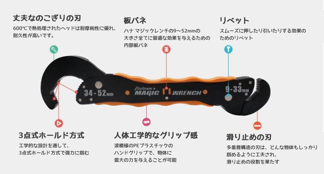 ハナマジックレンチの9~52mmの大きさ全てに最適な効果を与えるための内部板バネ