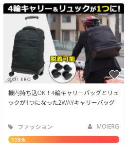 ご支援頂いた皆様のおかげで目標100%を達成することができました!ありがとうございました!当プロジェクトの支援期間も12月20日迄と残り2週間ちょっととなりました。このとても便利で使う人の立場で考えつくされた4輪リュックキャリーをより多くの方々に喜んで頂けるようにより多くの人々に目にして頂くように尽力させて頂きますので引き続きご支援頂けると幸いです。尚、リターンの品は、12月22日に発送し、クリスマスにはお届けできるようさせて頂く予定です。発送先もご指示頂ければプレゼント先へお送りすることもできますのでプレゼントとしてもご検討頂ければ嬉しいです。最後に当プロジェクトのURLを記しておきます。https://camp-fire.jp/projects/view/515553㈱龍屋半左衛門MOIERG(モアエルグ)石原和幸