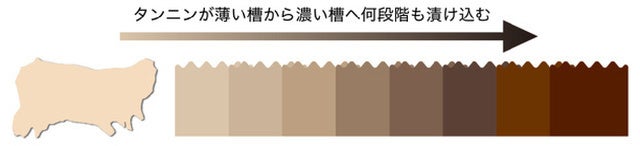 何段階もの濃度や成分が違った槽へと皮を漬け込む、時間と手間がかかる製法にこだわっています。