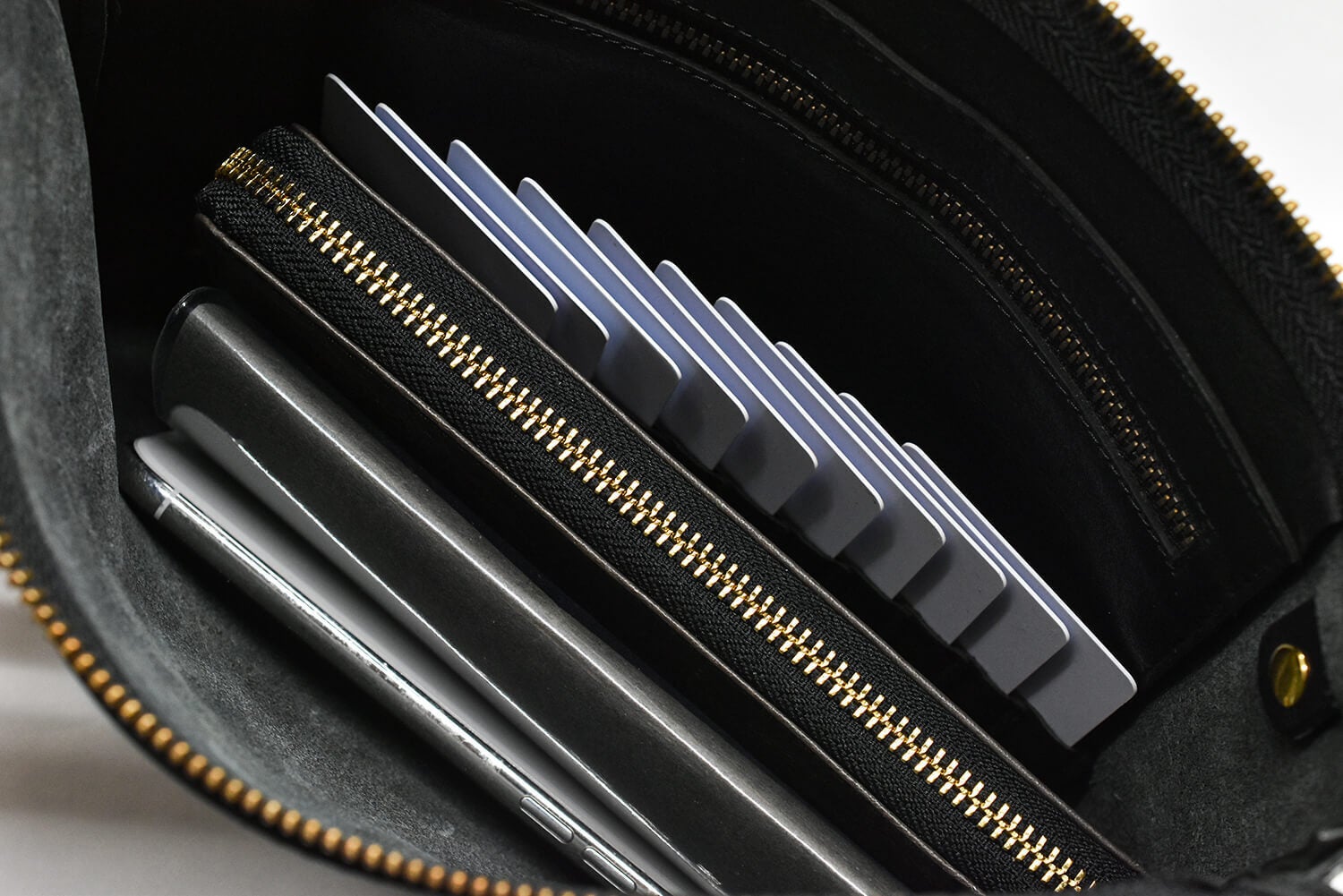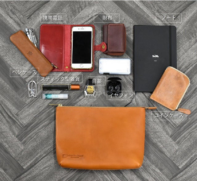 しかしミニクラッチの容量では長財布が収納できないなど、少し物足りないので、見た目はスマートながらも満足できる収納力を実現しました。