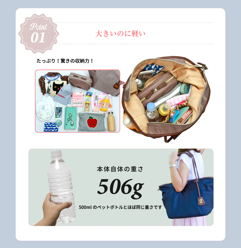 何より嬉しいのは、バッグ自体が軽いからどれだけ長い時間使ってても肩が楽なところです。
