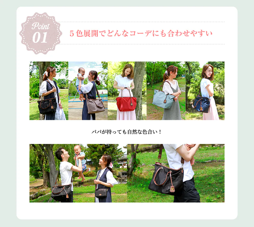 子どもを追いかけなくちゃいけない場面でも手持ちのバッグをすぐに肩かけに変えられるので。