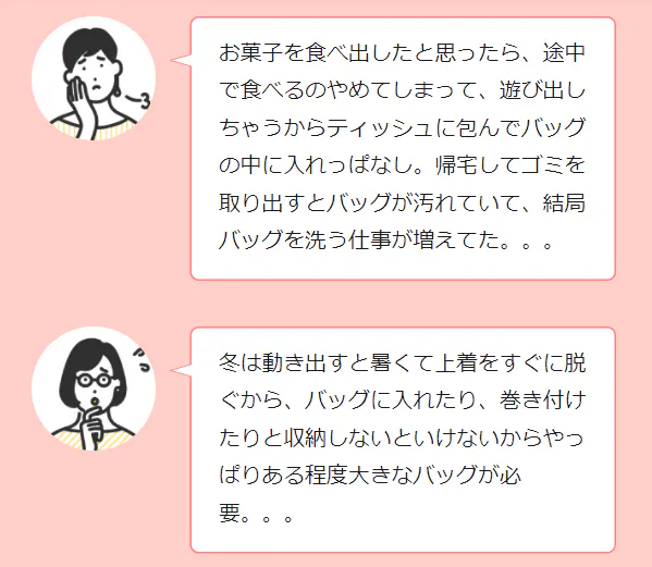 「おもちゃや飲み物をすぐに取り出そうと思っても 手間取った」といった