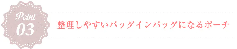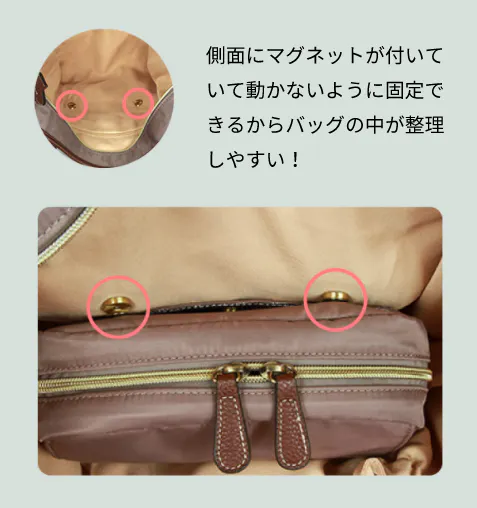 バッグが傾いても物が落ちにくいうえに、必要な時にはすぐに取り出せるようになっております。