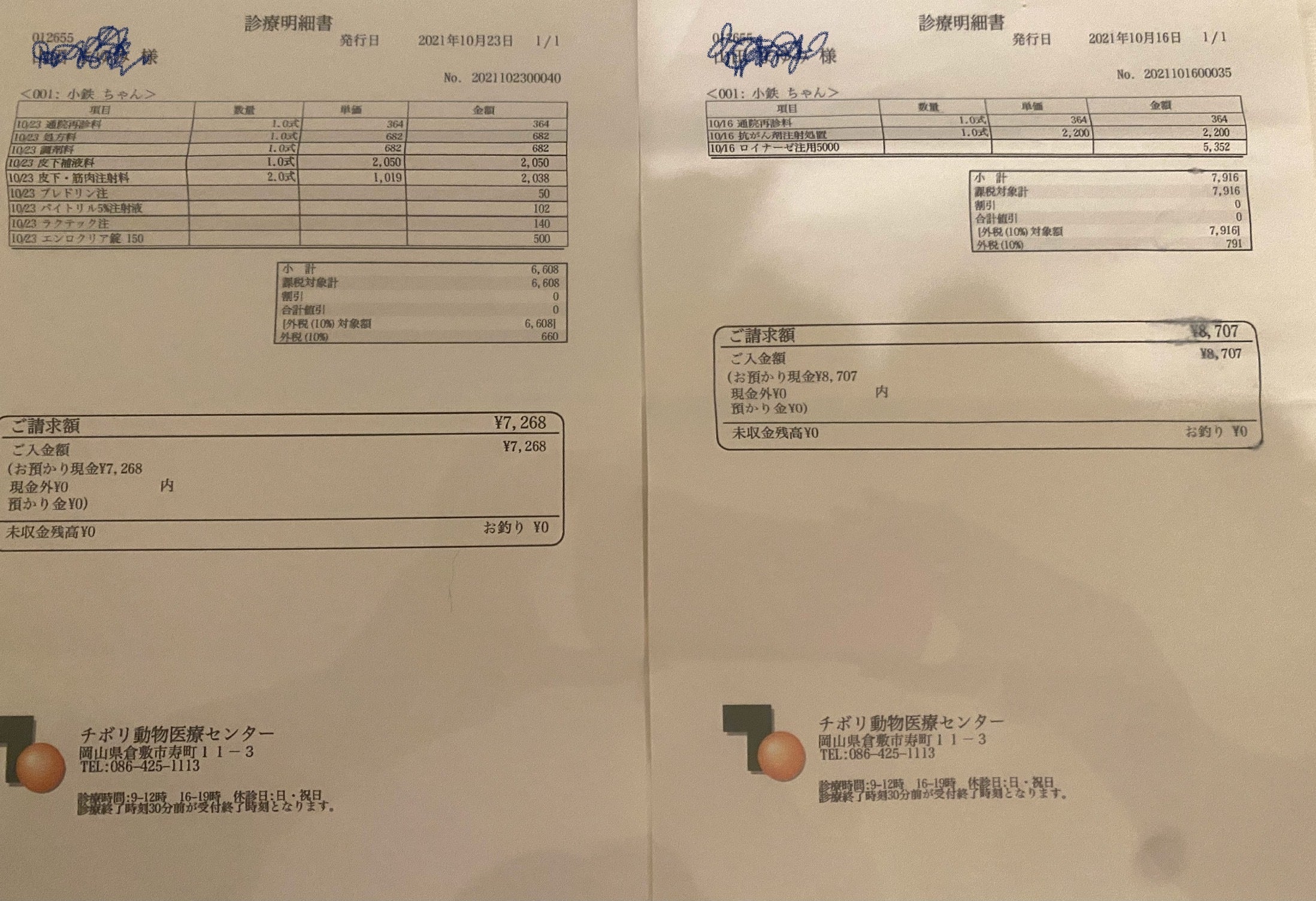 CTと鼻腔内乳化吸引手術、毎週2回のステロイドや脱水防止の点滴の明細です。