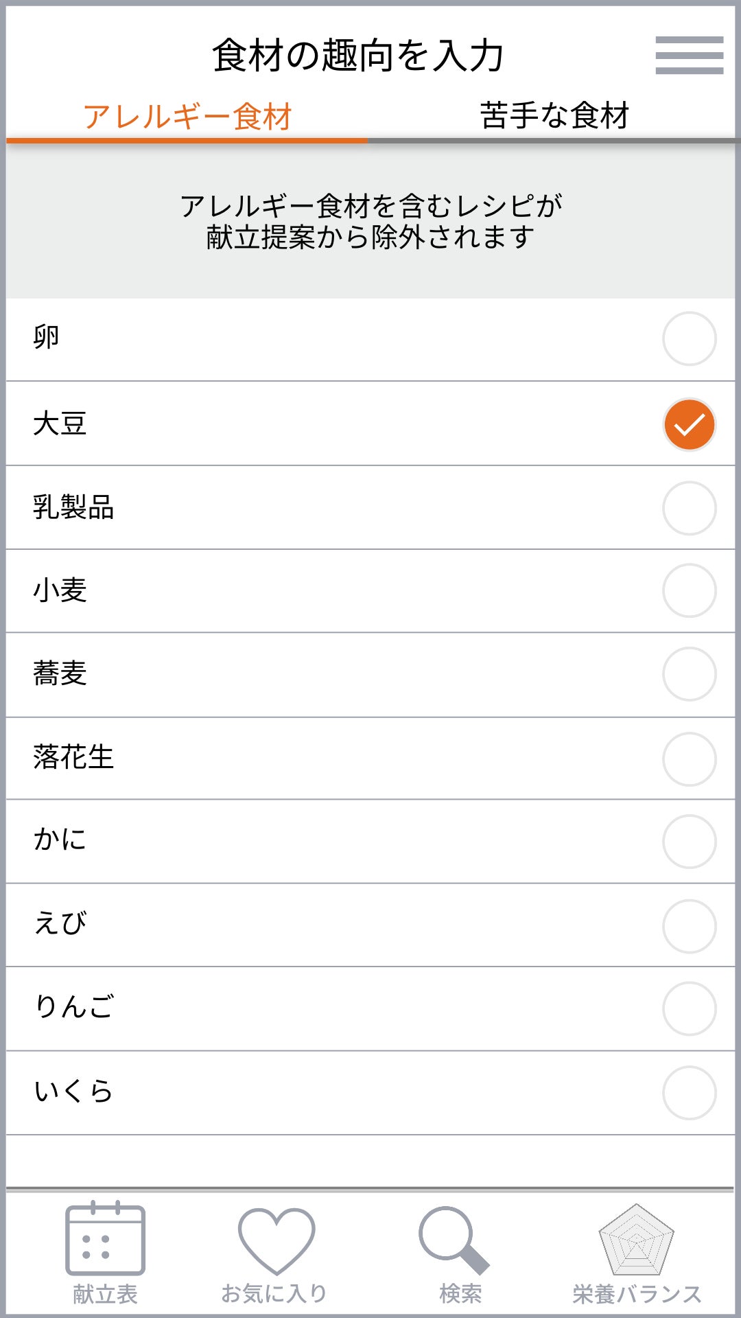 アレルギーや苦手な食材を入力します。