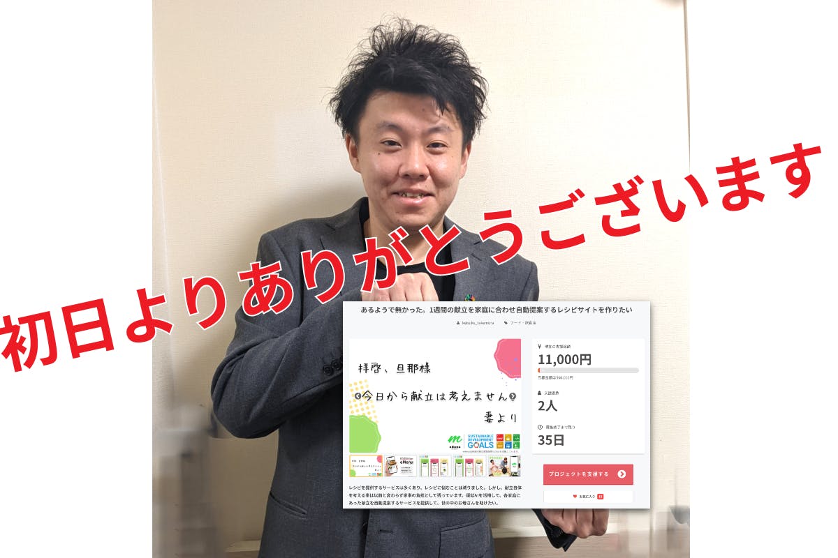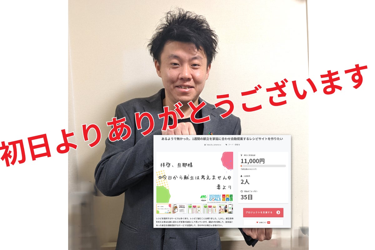2021/11/23 14:02こんにちは!アドペンタス代表の竹村です。初日無事公開でき、2名からのご支援もいただき感謝に尽きる初日でございました。hide_z様、guest66006ffbad74様、誠にありがとうございます。より精度高く開発を進めて参りますので、引き続きご助力、ご支援の程よろしくお願い申し上げます。初めてのプロジェクト公開で不慣れな部分が多く、活動報告として何を記載すべきなのかが分からない中での、初めての活動報告となりますので、お見苦しい点等はご容赦いただけますと幸いでございます。さて、私事ではございますが、先日一般社団法人SDGs大学という場所で、SDGsカタリストの講習を受け、SDGsカタリストとしての認定を受けました。eMenu[イーメニュー]のサービスコンセプトとSDGsの理念が合致する部分、そして何より私自身が今まで、そしてこれからもですが、誰かに助け、与えられてきた人生で、私自身も与える人、助けれる人になりたい。いや、ならなければならないのではないか?という考えの下、SDGsカタリストという資格を取ることにしました。カタリストとは、SDGsの理念を始め、SDGsの事に関して広く波及させる事ができる資格です。本プロジェクト内でSDGsのロゴの使用をしておりますが、こちらも国連への申請を行っております。2030年までに達成すべき17の目標、169のターゲットとして、世界の問題を解決するため、同じ目標に向かって193ヶ国そして70億人以上が向かっている。そう考えると凄いことだと私は思います。中には理想を語っているだけではないか?と仰られる方もいらっしゃいますが、まずは理想を語らないと現実は変わらないと私は思います。本プロジェクト(eMenu)も元々は理想からスタートしています。誰もが食卓を囲む事に不自由なく、毎日笑顔溢れる家庭であって欲しい。確かに、このプロジェクトを公開するに至るまで、他人の家庭なんぞ関係ないやろ。など厳しいお言葉をいただくこともございました。でも、私は、お人好しでありたい。お人好しで何が悪いっ!!ぐらいに思っています。正直、eMenuの開発費用、運転資金など合わせると安い買い物ではありません。新車の普通車1台は簡単に買えますし、2年程度のランニングコストで家が建ちます。それでも、日本の働くお母さん、偏食やアレルギーに悩むお子さんが笑顔で食卓を囲む事が実現できる日を日々思い浮かべながら、開発会社の商談やプロモーションを行っています。いつか、eMenuのおかげで料理することが楽になった。食卓を囲む時間が増えた。という家庭が増える事を日々楽しみにしています。【リターンについて】明日にはなりますが、新しいリターンの追加を予定しております。数名の方より、支援したいけどCAMPFIREへの会員登録が面倒だね。などのお声をいただきました。ルールと言いますか、ある程度の線引をさせていただき、弊社が代行してリターン購入ができる方法を本日中に取りまとめ、明日には公開できる流れで進めております。もし、ご友人、知人の方々に拡散いただき、ご賛同いただけたにも関わらず、会員登録などでご不便をおかけしている事がありましたら、メッセージまたは以下に記載しますアドレスまでご連絡頂戴できますと、私からご連絡させていただきますので、よろしくお願い申し上げます。まだ2日目ではございますが、気を抜かず35日間走り続け、その後の開発も抜かり無く進めて参りますので、応援、ご支援、拡散よろしくお願い申し上げます。《アドペンタス(eMenu専用対応連絡先)》info@adpentas.com最優先でご対応させていただきますが、返信に最大3営業日を頂戴する場合がございます。営業日:月曜日〜土曜日(祝日も営業しております)営業時間:AM10:00~PM7:00 もっと見る