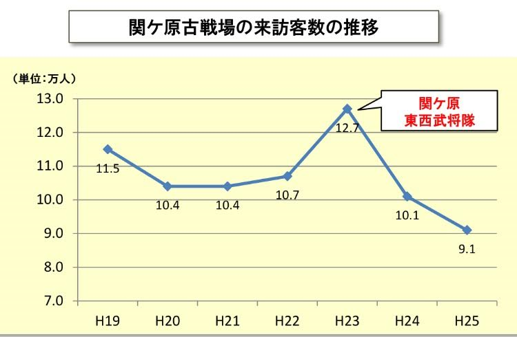 関ケ原町は人口減少とともに観光客数も減りつつある。