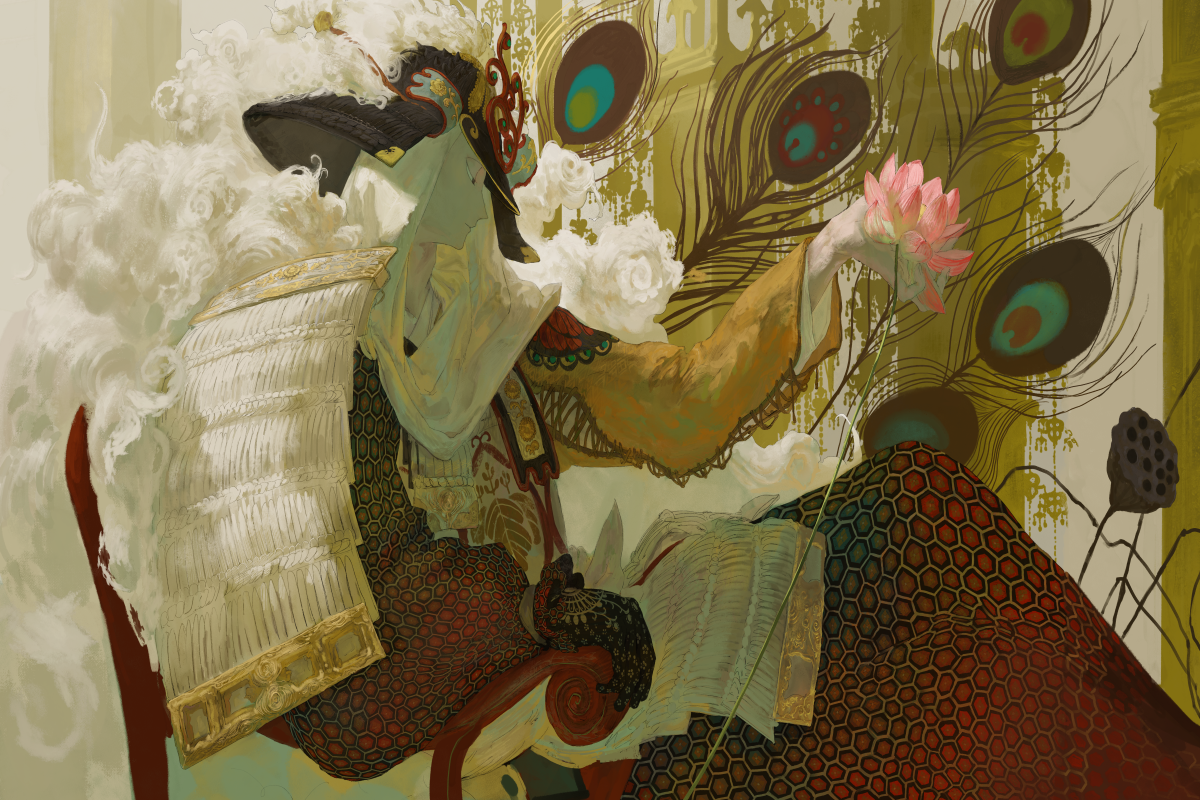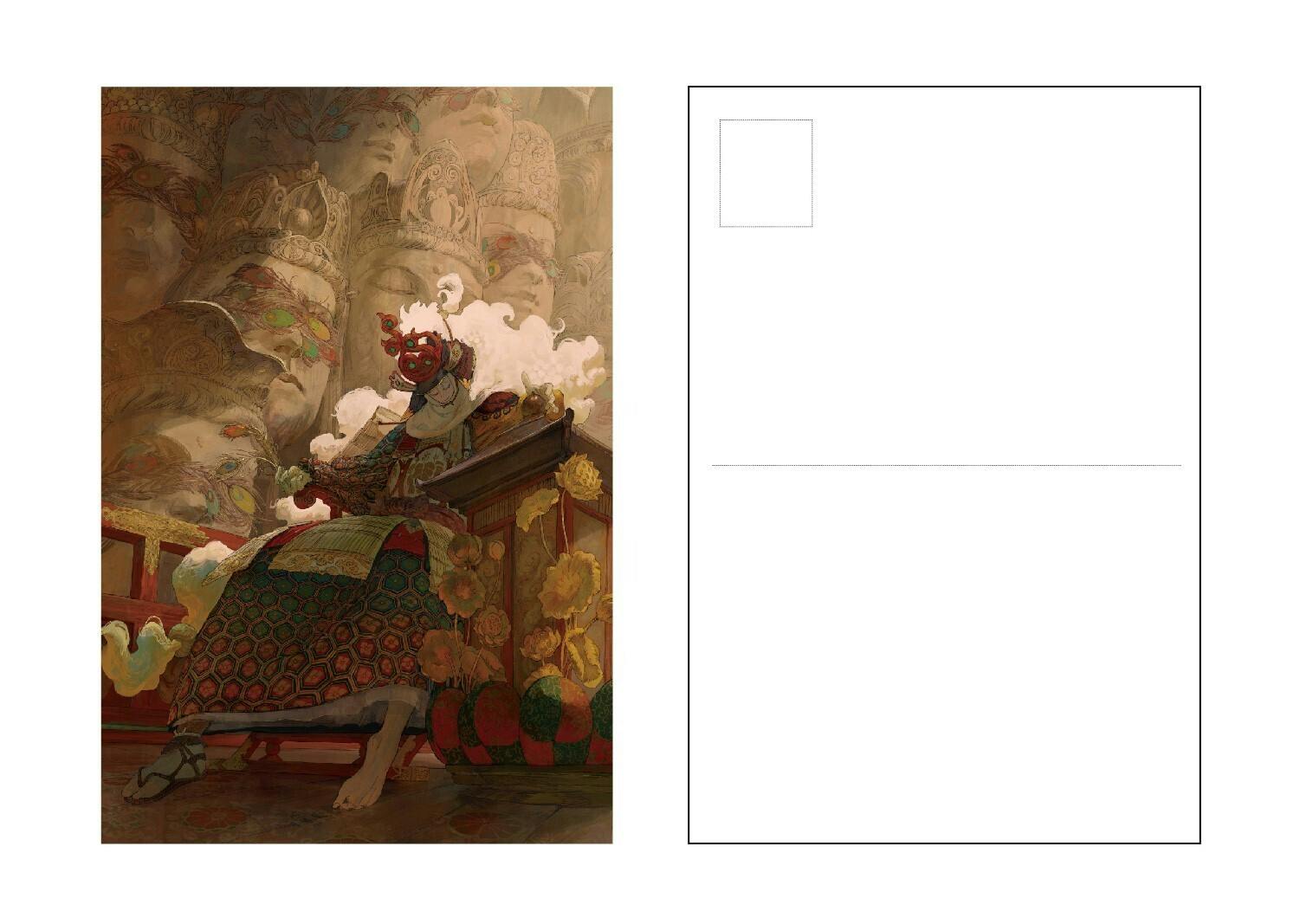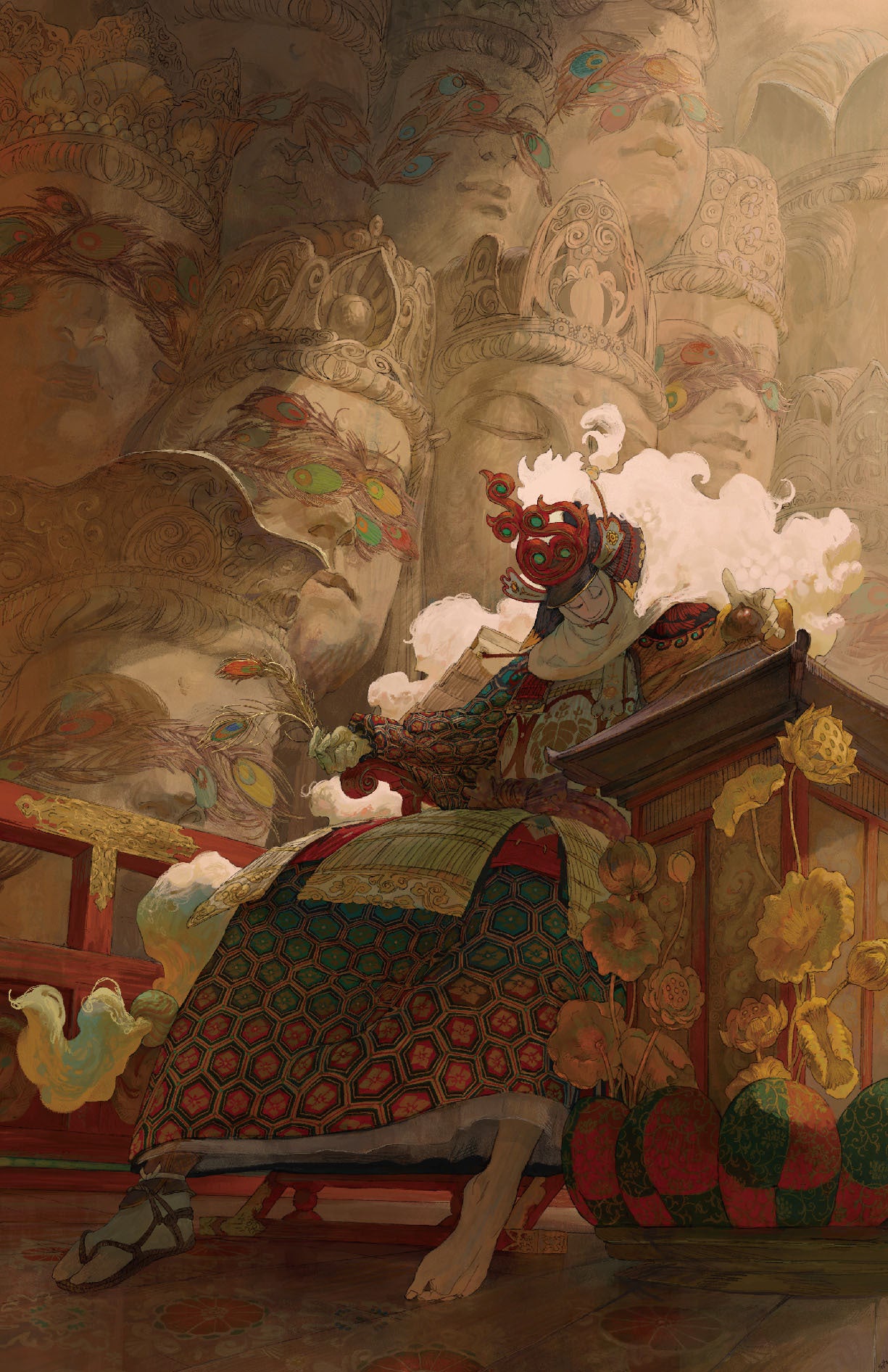 イラストレーター『おく』:今までに摂取してきた作品からの影響というのも確実にあるのでその他で言うなら、自身の生育環境が大きく関係している気がしますね。いわゆる原風景てのが絵に如実に出てきています。 だだ広い畳の間、板の間、障子、土壁、襖、柱、地袋、霞棚、天井、虹梁、化粧垂木、懸魚、瓦、砂利、石畳、草、木、仏、、、