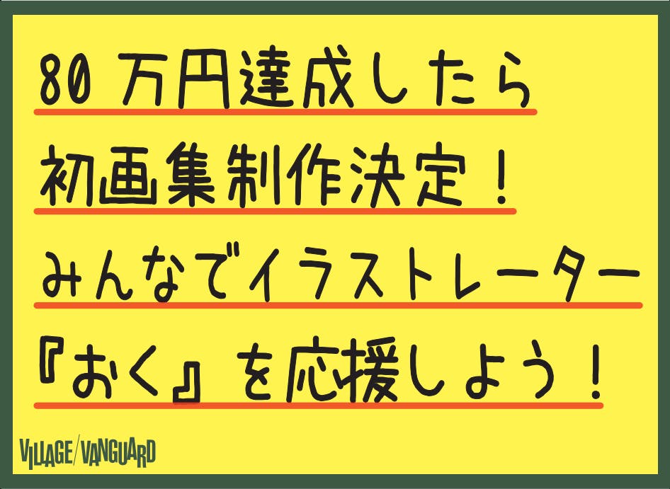 イラストレーター『おく』画集制作プロジェクト!!について最後までご覧いただき、誠にありがとうございます。今回のクラウドファンディングにおけるクリエイター応援プロジェクトは、私たちヴィレッジヴァンガードとしても非常に重要な試みです。このプロジェクトをきっかけに、日本のクリエイターの方々をヴィレッジヴァンガードが応援することで少しでも多くの方へ知っていただくきっかけ作りができれば幸いです。