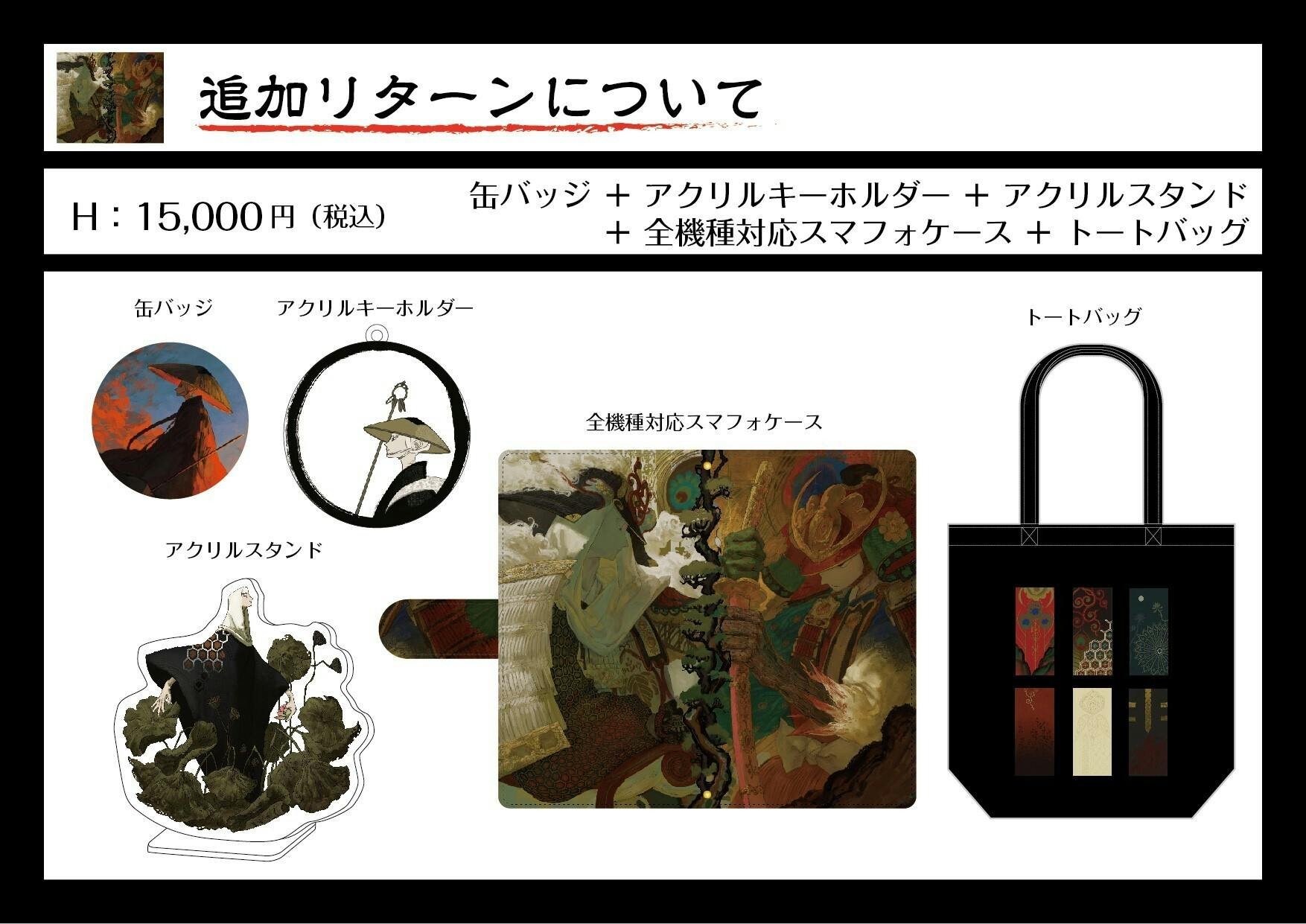 缶バッチ+アクリルキーホルダー+アクリルスタンド+全機種対応スマフォケース+トートバックのリターン案となっております。