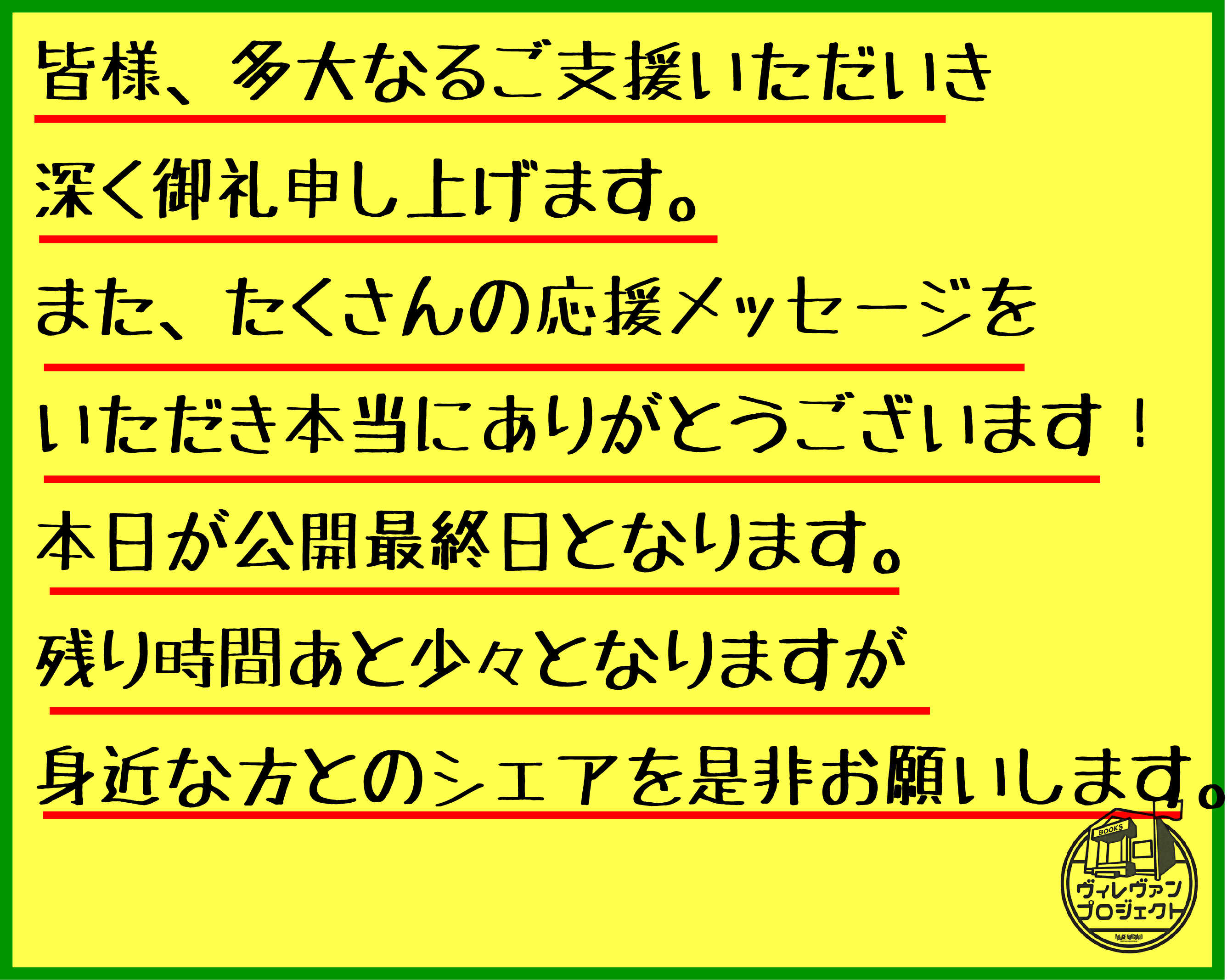 【最終日ご報告】皆様多大なるご支援をいただき誠にありがとうございました。本日最終日となります!