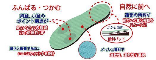 ポイントは自然に足裏アーチが使える2点構造!そのためには、 ・中足骨を支えること ・中足骨が動いた時に邪魔をしないこと が重要なので、 ・接地する第一中足骨の付け根(母趾球)と第五中足骨の付け根(小趾球)を支える ・土踏まず部分の空間を保つ ように設計がされています。