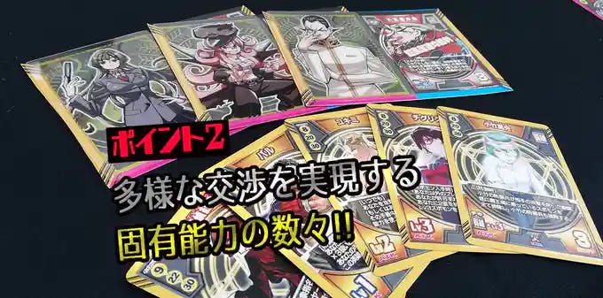 説得、恐喝、命乞い……。いろんな交渉をしよう! カードの固有能力も交渉に使えるものを色々と用意しているぞ! 状況により様々な交渉が可能だ。交渉に乗るも良し、突っぱねるも良し。仲良くケンカしよう!