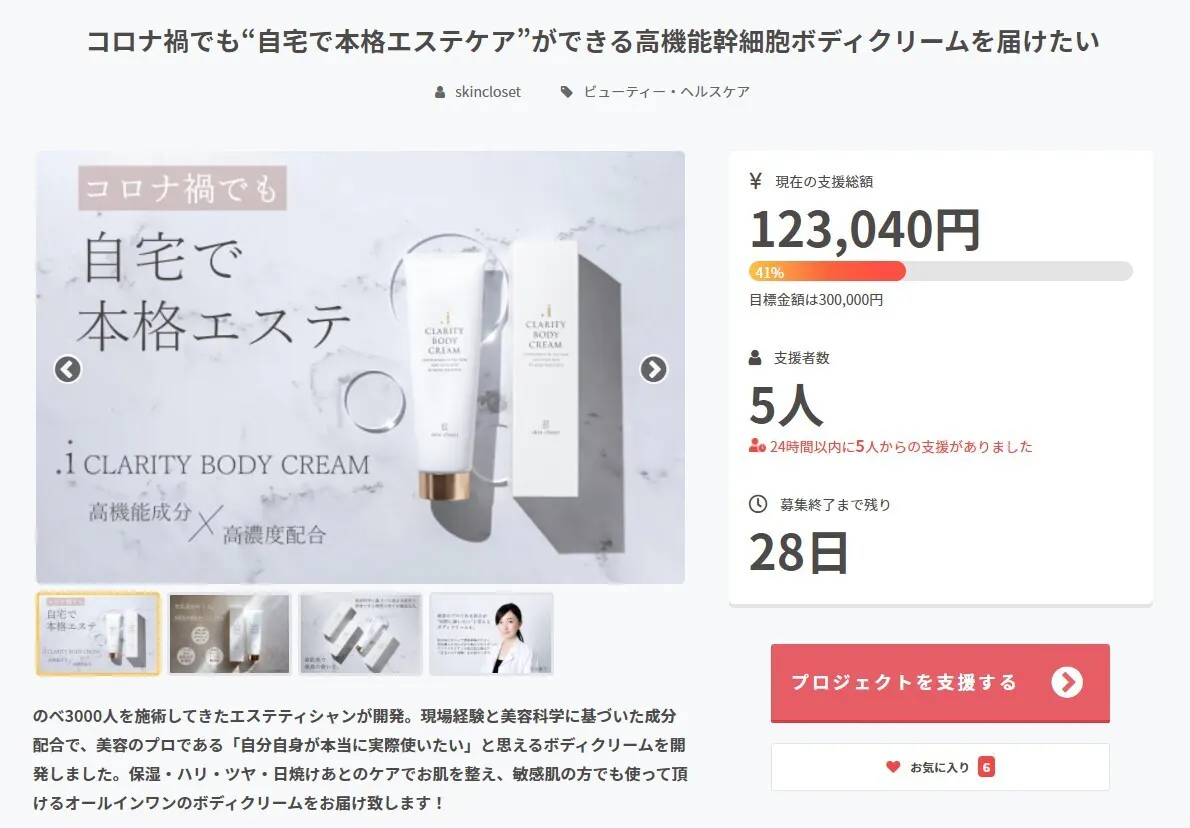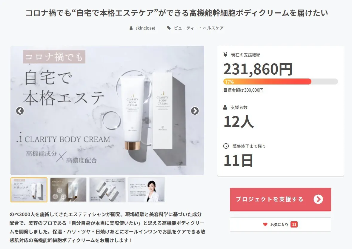 2021/11/19 18:51skinclosetの小谷です。ついに残り10日となりました!これまでご支援いただいた皆様、本当にありがとうございます!現状まだ77%と目標金額には至りませんが、各方面での情報発信等、最後の追い上げを頑張りたいと思います。オールインワンの高機能幹細胞ボディクリームとして、細かい部分まで徹底的にこだわり抜いた自身のボディクリームなので、たくさんの方に頑張ってお届けしたいと思います。引き続き、どうぞよろしくお願い致します! もっと見る