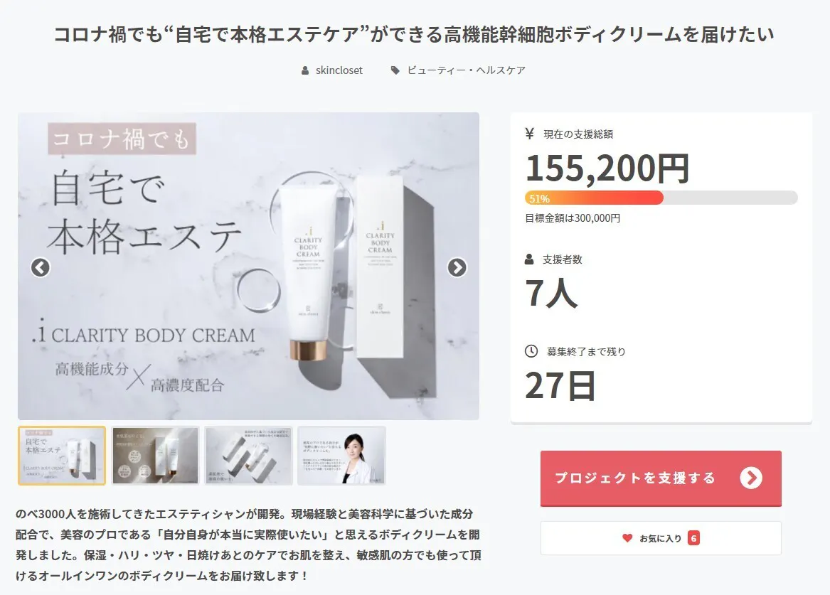 2021/11/03 23:34skinclosetの小谷です。本日3日目でしたが、なんと、お二方にご支援頂きまして、目標の50%を達成する事ができました!ありがとうございます!!!!!本数がたくさん入っているリターンをお選び頂き本当にありがとうございます。先ほど気付いたのですが、キャンプファイヤーってプロジェクトの終了期限が来るまで、どなたに支援を頂いたのか、どこの方に支援を頂いたのか見えないんですね・・・どうやらユーザー名しか見ることができず、一体誰が支援をしてくれているのか、よく分かっておりません!!^^;「新しくskinclosetを発見してくれて応援してくれている人なのか?」「身近な身内の方が支援してくれているのか?」今の所、よく分かっておりませんが、支援者の皆様には本当に感謝しております!ありがとうございます!!11月30日でプロジェクトが終了するのですが、その時にご支援頂いた方々のお名前やお届け先が正式に分かるとの事ですので、非常に楽しみです!!引き続き、どうぞよろしくお願い致します! もっと見る